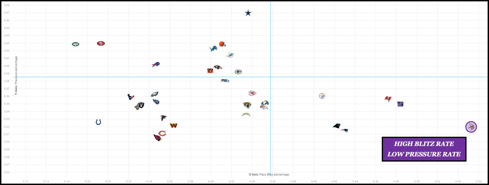 The chart above illustrates how novel the Vikings’ defense is. It sits alone in pressure rate, and though it ‘blitzes’ the QB at volume, the defense doesn’t generate that much pressure. But that is part of the plan. Flores has devised a system that forces the QB to process the blitz quickly and get the ball out of his hands.
