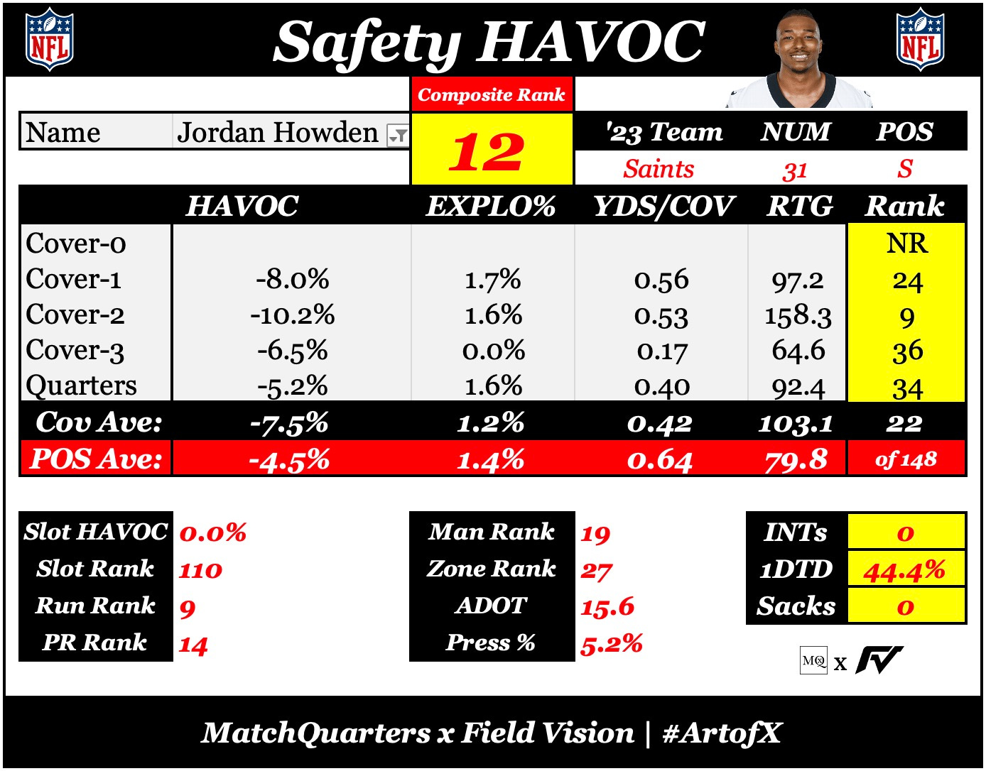 Although the defense finished third in Total Unit HAVOC rate (a metric that averages how often a defense makes negative plays affecting the offense), the defense was inconsistent, which was exacerbated by playing opposite an inconsistent offensive unit. Even with one of the easiest schedules in the NFL, the Saints couldn’t find enough wins to make the playoffs.