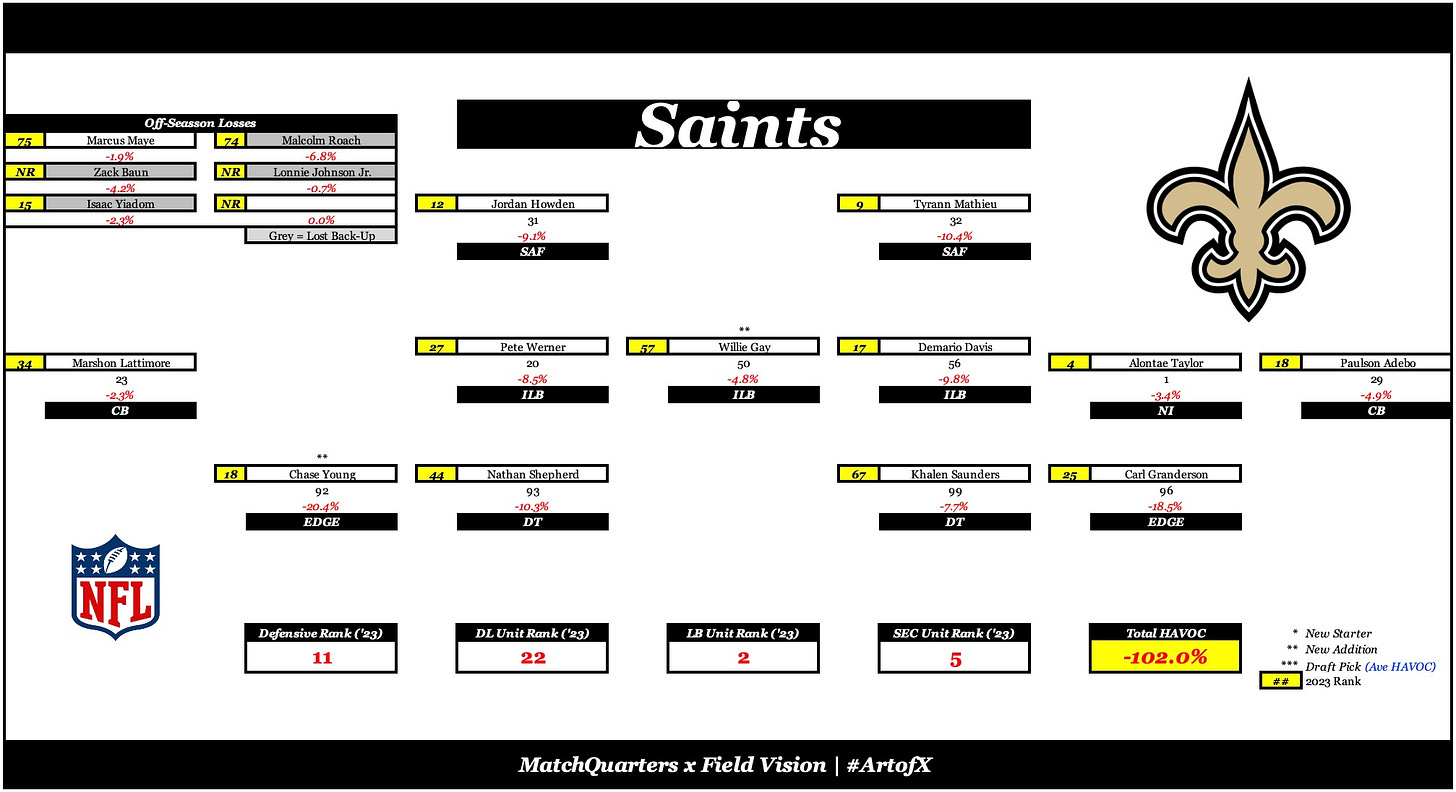 This offseason, the Saints added DE Chase Young (SF/WAS) and hybrid off-ball LB Willie Gay (KC) to help push the Saints into the threshold of elite defense. Last year, the unit finished 15th in DVOA, 12th against the pass, and 23rd against the run (FTN). The inconsistency in play was partly due to an injury-riddled season for projected starters Marcus Maye (Safety), Marcus Lattimore (CB), and WR Micheal Thomas.