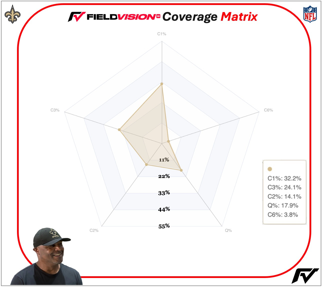 Allen’s philosophy resides within the 4-3 universe. All the ‘old’ classics from the 4-3 appear when you watch the Saints. Allen cut his teeth in the NFL during the early 2000s, which was Cover 1 heavy outside the Tampa 2 clique of coaches. Joe Woods, who is currently the DC under Allen, stems from a middle-of-the-field closed (MOFC) philosophy and, when in Cleveland, ran more Cover 3.