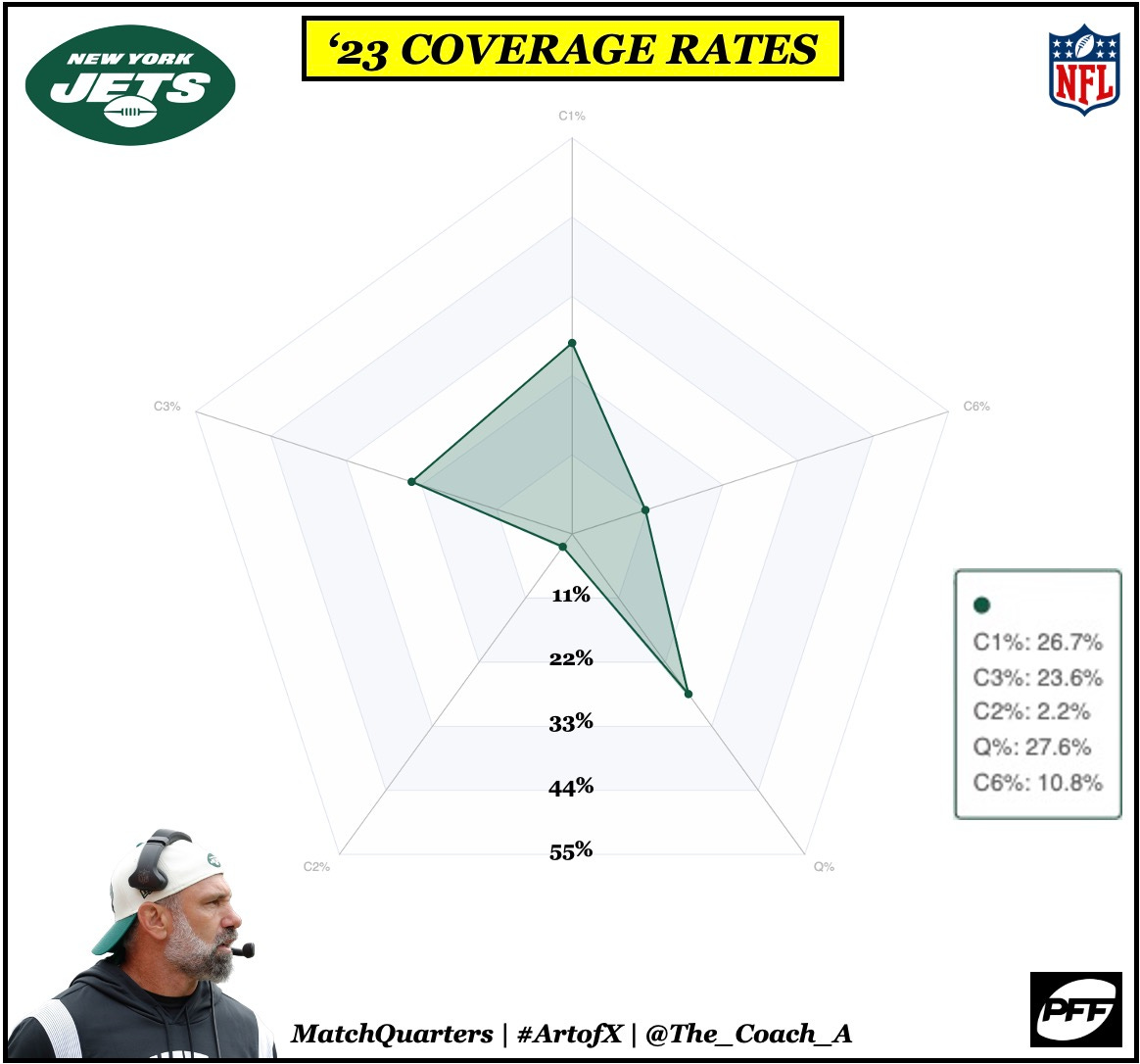 For two years in a row, the Jets have been one of the NFL’s leaders in Quarters coverage usage. Last year, New York led the league in its use at ~26% of its snaps (In reality, it was much higher). This year, only the Cardinals ran a higher amount. Since ‘18, Robert Saleh has made a concerted shift from Cover 3 to Quarters, and the trend is not going away.