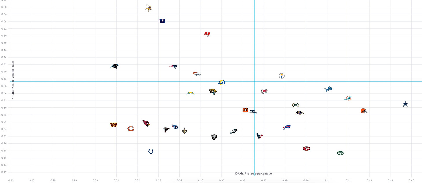 Overshadowed by their defunct offense, the New York defense has quickly become one of the best in the NFL under defensive coordinator Jeff Ulbrich and the guidance of Head Coach Robert Saleh. The Jets have one of the best interior defensive lines anchored by Quinnen Willians (#95) and Quinten Jefferson (#70). Interior pressure has always been a source of disdain for QBs and run games. Last year, the Jets had the lowest Pass Blitz Rate (PBR) in the league yet the fourth-highest pressure rate.