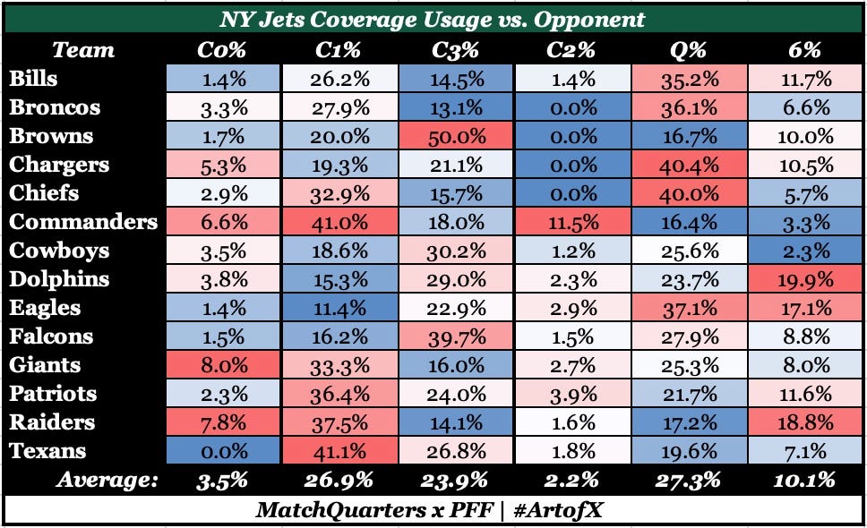 Offenses like the Bills, Chargers, and Chiefs saw a high volume of Quarters from the Jets (above). The Eagles most likely saw more Quarters because of the ‘six-back offense’ in place there. Quarters allows you to have a QB player on either side of the box, whereas MOFC coverages house the QB player in the middle of the field and at depth, which can spell disaster in the run game.