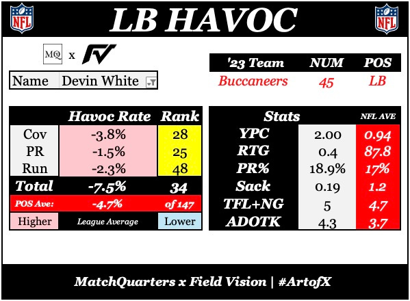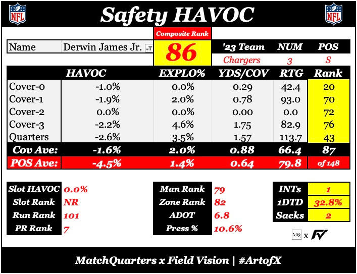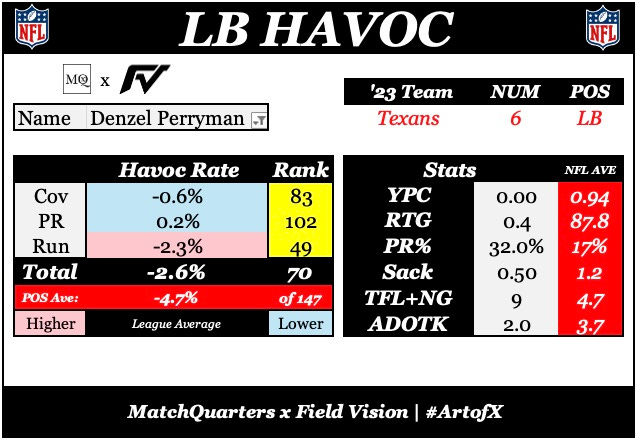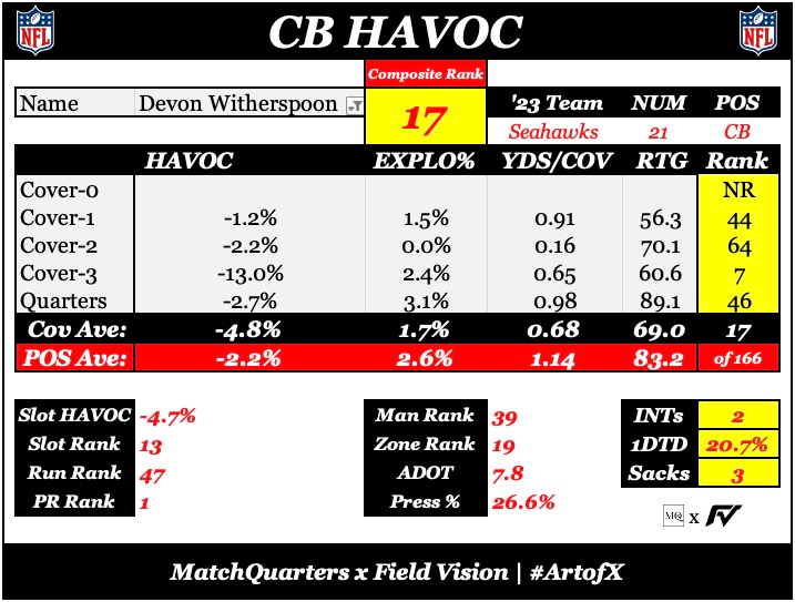 HAVOC allows us to track free agency signings and paint a better picture of their fit. Should the Commanders, who will play mainly man and 3-match coverages, bring in a zone-centric CB? No, that wouldn’t be wise. Using HAVOC allows us to see how teams are building their rosters defensively. So remember, these numbers show how productive the player was in the scheme they played in last year, which is reflected against their peers in their overall ranking.