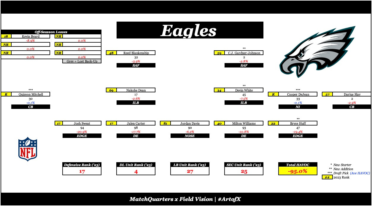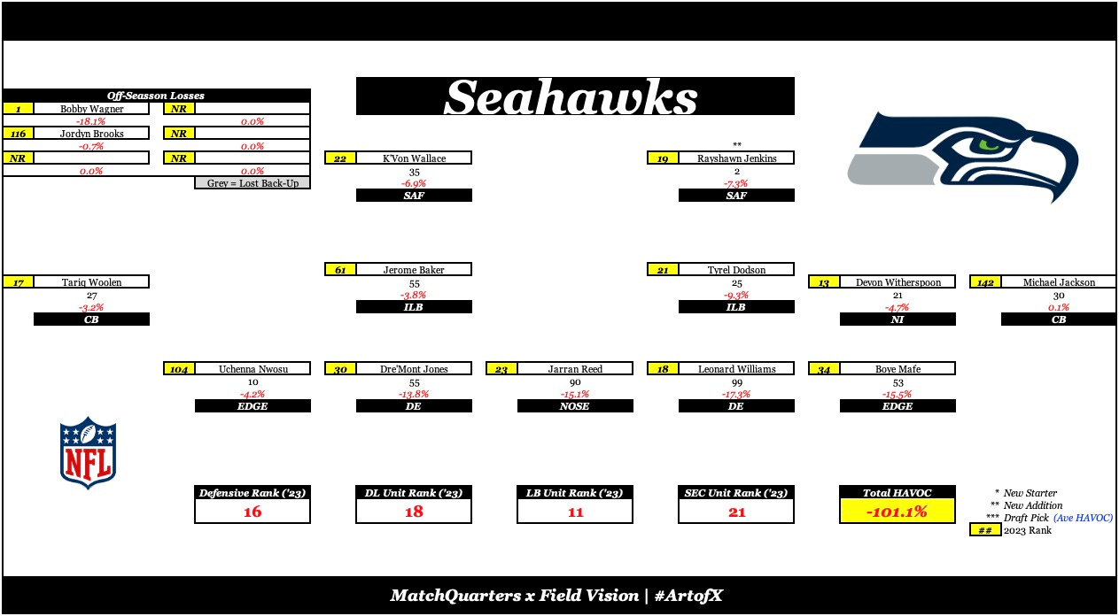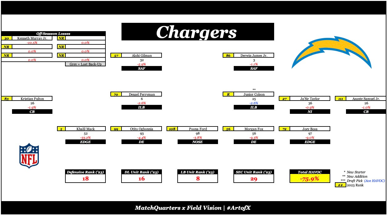 Each week leading up to the season, I will review the roster, schemes, and outlook for each defense in the NFL. I have a depth chart for every team with their 2023 Field Vision Sports HAVOC rankings and scores. Projected rookie starters will receive the league average HAVOC for that position. Notable losses are located in the upper left-hand corner. Click on the picture to expand for a better look.