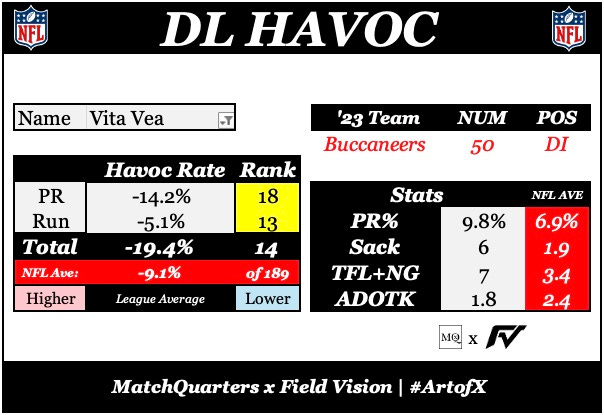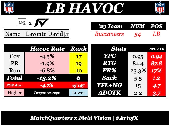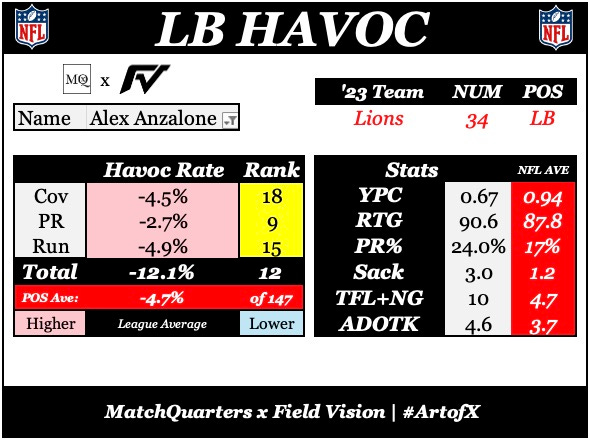 What is HAVOC? I wanted to create a metric that better understood how defenders play within their scheme. For the D-line and LBs, it is pretty straightforward. Can you fit the run and create a pass rush? For LBs and some Edges, coverages have also been added.