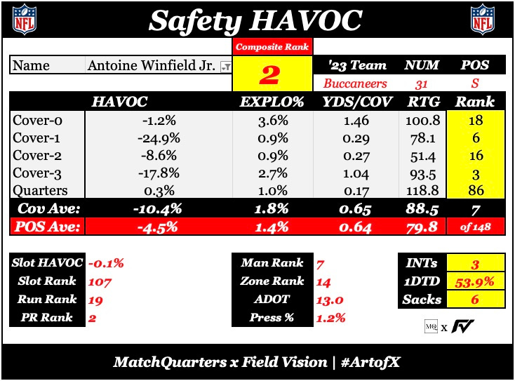 Winfield was an elite do-everything workhorse as a pass rusher and one of the best run-stopping safeties in ‘23. He also dominated Cover 1 and Cover 3, which are the preferred coverages of Bowles.