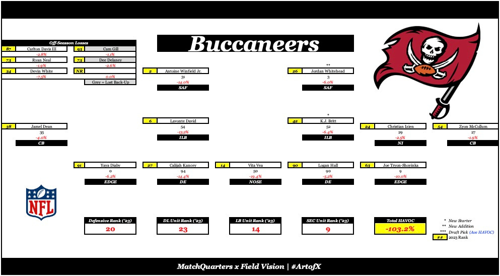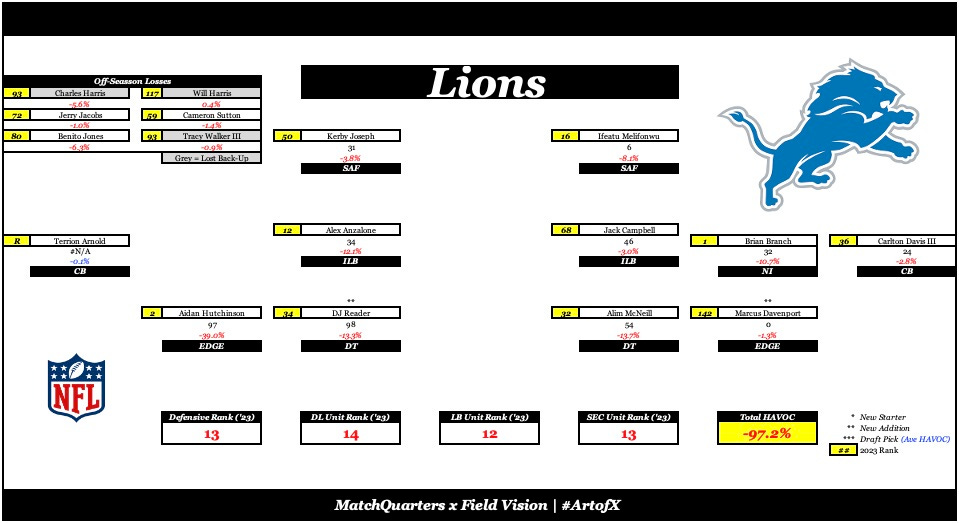 Each week leading up to the season, I will review the roster, schemes, and outlook for each defense in the NFL. I have a depth chart for every team with their 2023 Field Vision Sports HAVOC rankings and scores. Projected rookie starters will receive the league average HAVOC for that position. Notable losses are located in the upper left-hand corner. Click on the picture to expand for a better look.