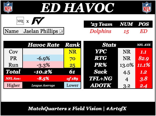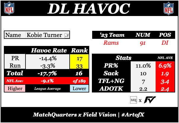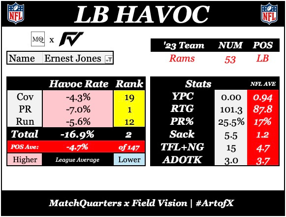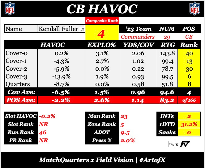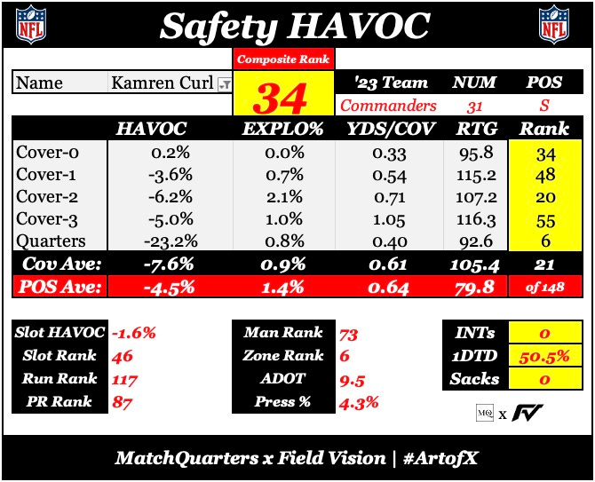HAVOC allows us to track free agency signings and paint a better picture of their fit. Should the Commanders, who will play mainly man and 3-match coverages, bring in a zone-centric CB? No, that wouldn’t be wise. Using HAVOC allows us to see how teams are building their rosters defensively. So remember, these numbers show how productive the player was in the scheme they played in last year, which is reflected against their peers in their overall ranking.
