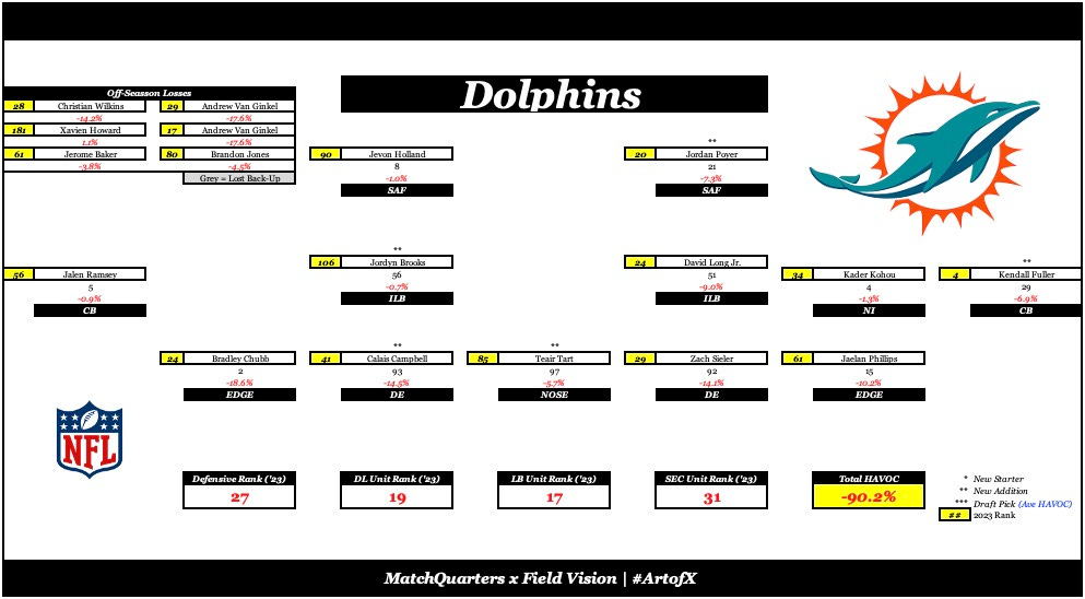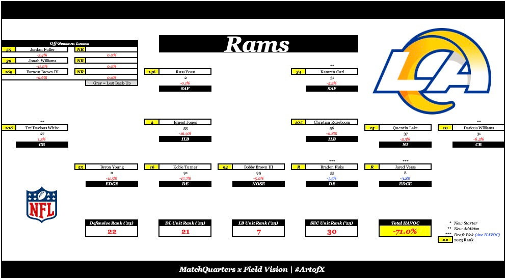 Each week leading up to the season, I will review the roster, schemes, and outlook for each defense in the NFL. I have a depth chart for every team with their 2023 Field Vision Sports HAVOC rankings and scores. Projected rookie starters will receive the league average HAVOC for that position. Notable losses are located in the upper left-hand corner. Click on the picture to expand for a better look.