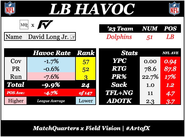 What is HAVOC? I wanted to create a metric that better understood how defenders play within their scheme. For the D-line and LBs, it is pretty straightforward. Can you fit the run and create a pass rush? For LBs and some Edges, coverages have also been added.
