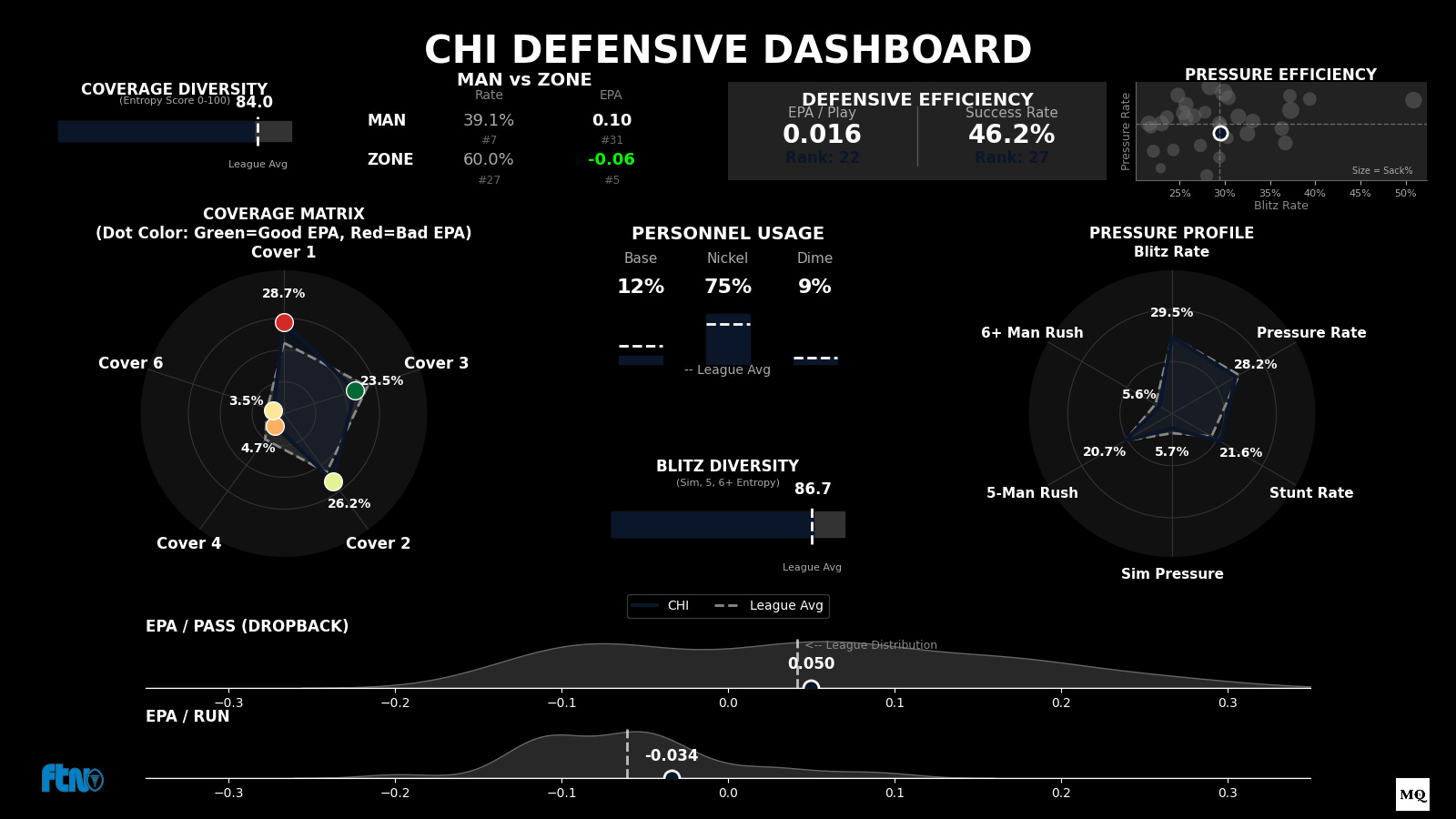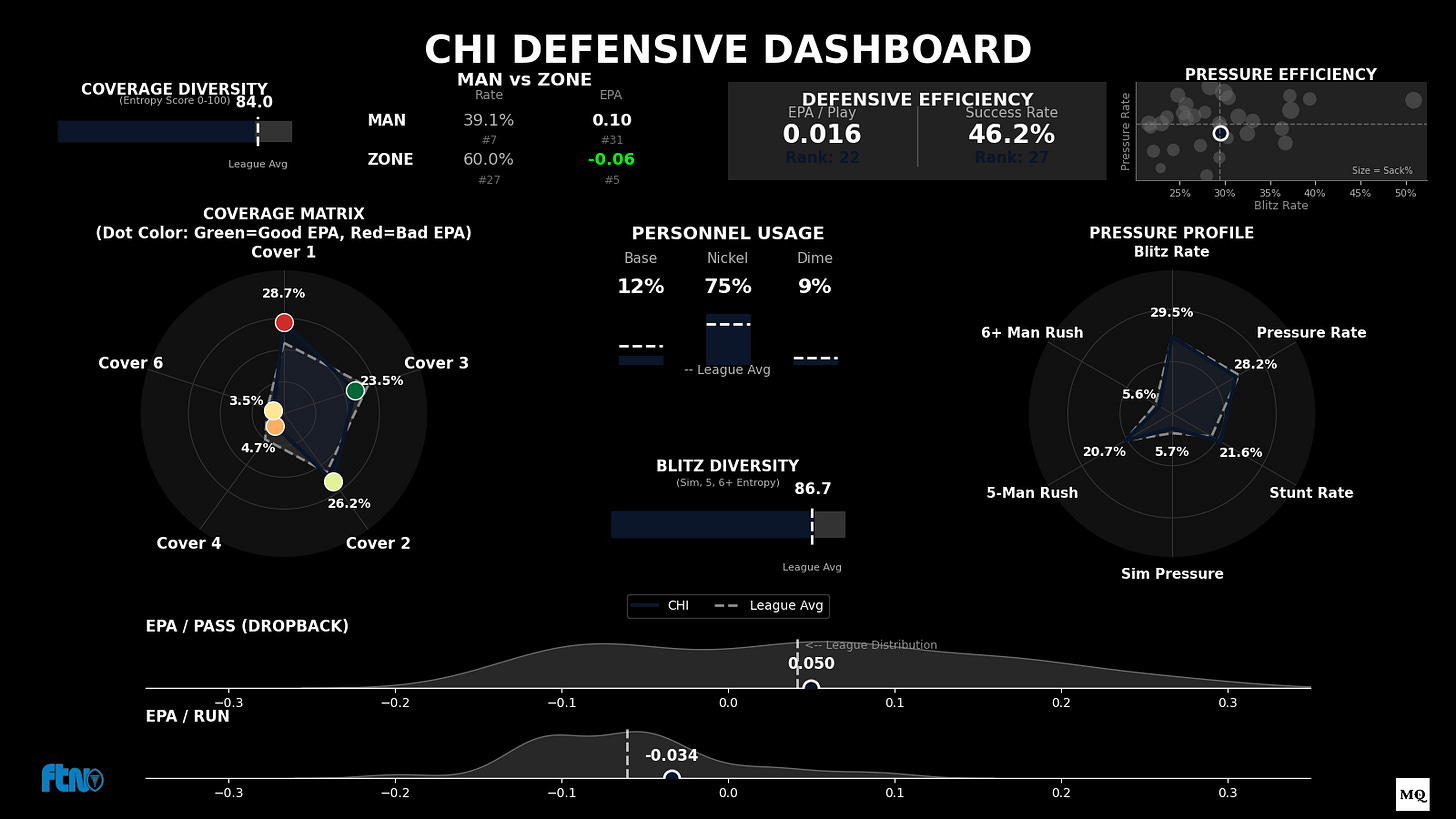 The Issue: Chicago’s defense has surged to a 29.2% Pressure Rate (Rank 11) using just a four-man rush ("Controlled Contain").