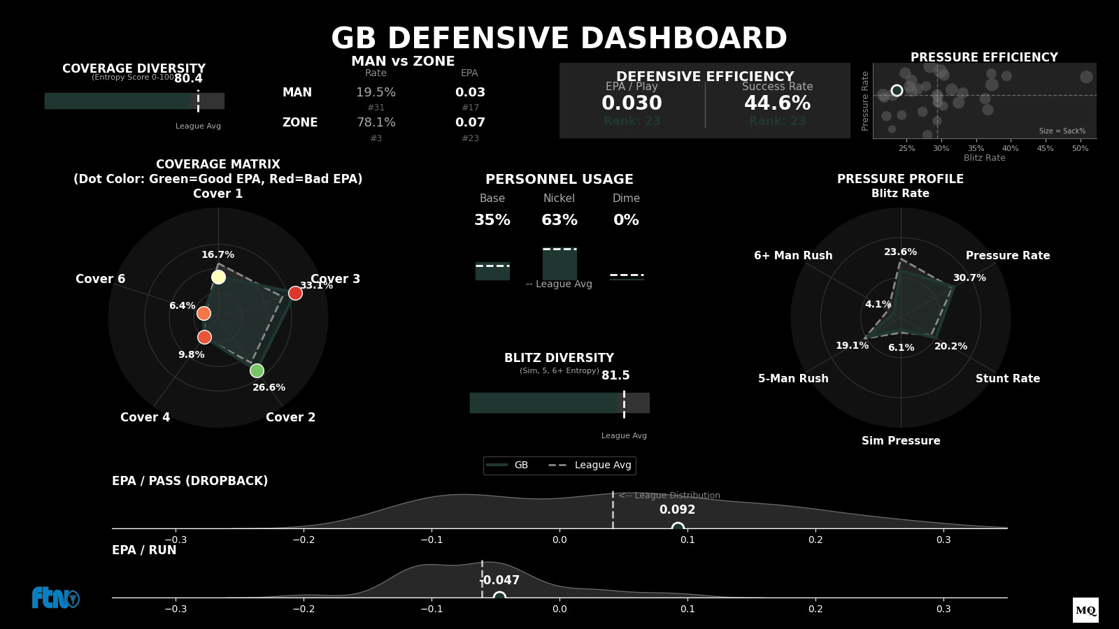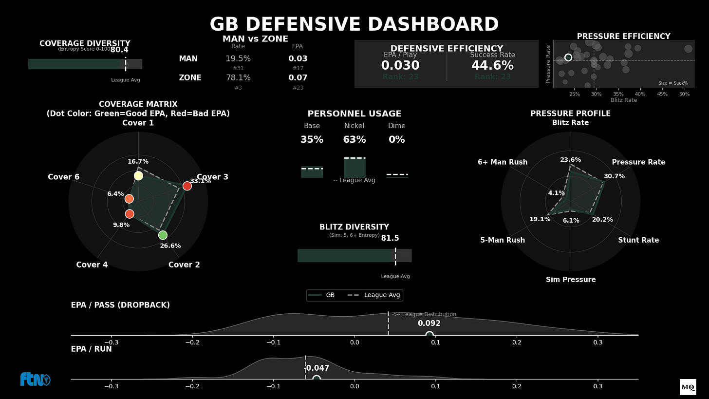 The Dime/Run Paradox: They play Dime (6 DBs) on 29.7% of snaps (Rank #1), yet they boast the #4 Run Defense DVOA (-16.0%). They are stopping the run with light boxes better than almost anyone.
