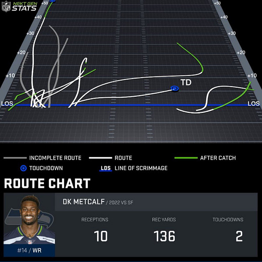 When the Eagles pass: The Eagles are dominant on the ground, which keeps them from having to play a “drop-back game.” RPOs and play-action thrive because of the run game. Plus, the throws are usually in-breaking and in front of the QB. The combination of DeVonta Smith at Slot and AJ Brown out wide can be deadly. Both have game-breaking potential. The Eagles’ passing game works so well because of the run game. As defenses attempt to load the box, significant gaps in the field open up, and their two main WRs, Brown and Smith, get one-on-one opportunities downfield. San Fransisco entered the playoffs as the #5 defense in pass DVOA. Two games into the playoffs, the secondary has given up some outside plays. Brown is a definite issue outside. As I mentioned in a tweet from earlier this week, the perceived success passing for the Seahawks was because they utilized Metcalf down the field. The Eagles have two bonified deep threats and can attack the 49ers in a way that Dallas and Seattle could not.