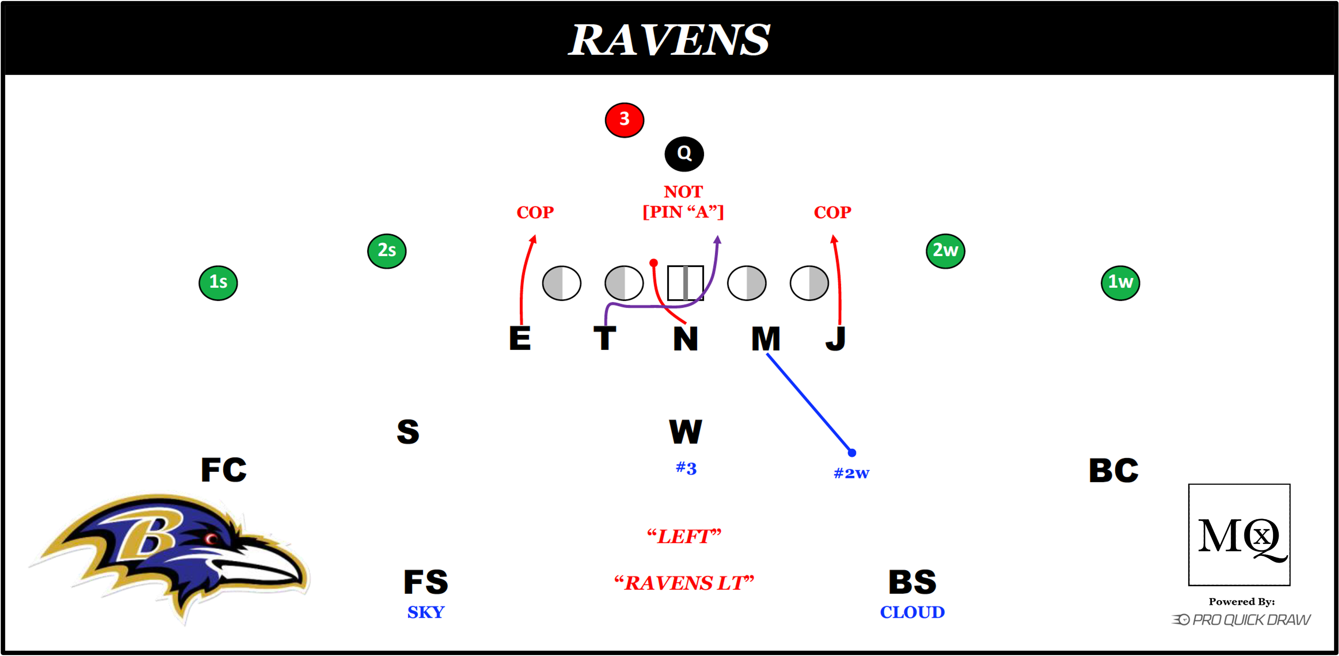 The Dolphins have set themselves up for success by utilizing two main concepts, a 5-O front, and a BOSS alignment. Both concepts will help Miami attack the protection with a simple NOT stunt. In a NOT stunt, the Nose will work to the A-gap to the side of the 3 tech. (in this case, 4 tech.) while the DT will wrap to the opposite A-gap. I call this pressure RAVENS because the BOSS Front and NOT stunt will come from the field (in the NFL, the passing strength). The concept is shown below.