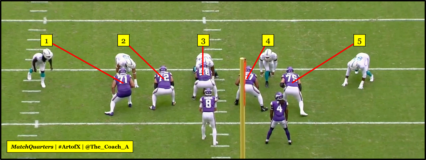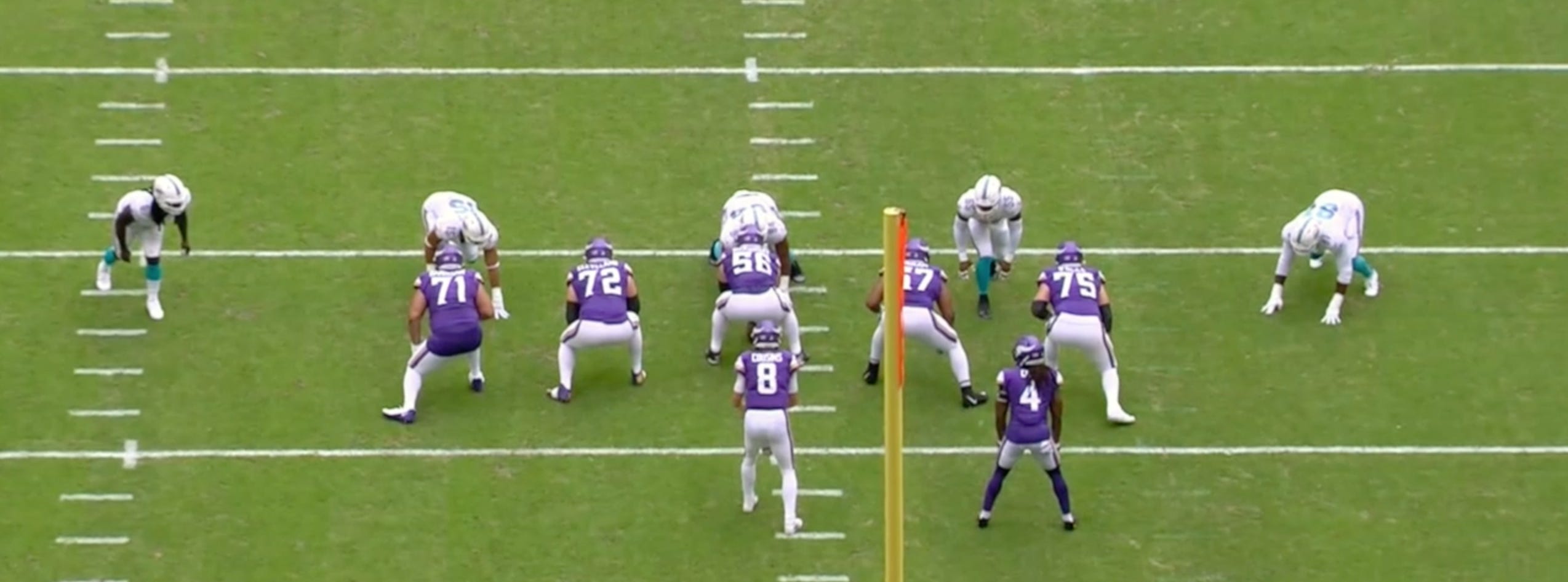 In the diagram above, the Dolphins have presented the Vikings with five defenders on the LOS. I call this particular 5-O alignment BOSS (Bigs On Same Side) or an overload front. Sometimes, an offense may choose to slide to the “bigs” side. In that case, pressures that attack away from the slide side can be used. When teams go to man-blocking, defenses can use simple line stunts to devastating effect.