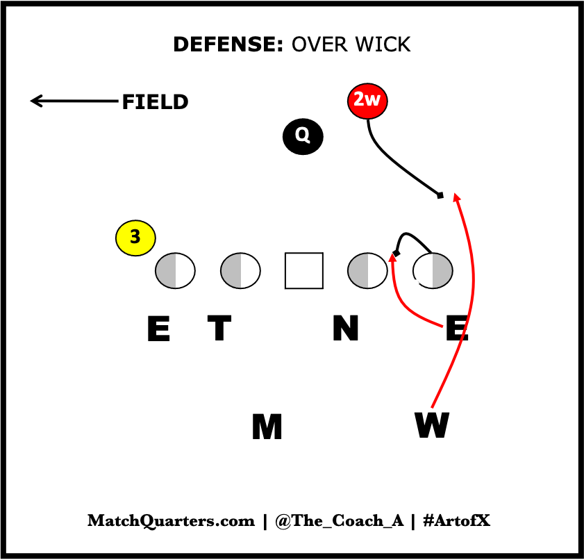 In 4-2-5 terms, this is a WICK (Will to C, below) pressure, but the field DE (F) will drop into coverage. Each Creeper can be paired with Quarters or Cover 3. As stated earlier, Leonhard is a single-high defensive coach. The use of the BREES path is not what makes Wisconsin unique. Most in the Aranda system use this path.