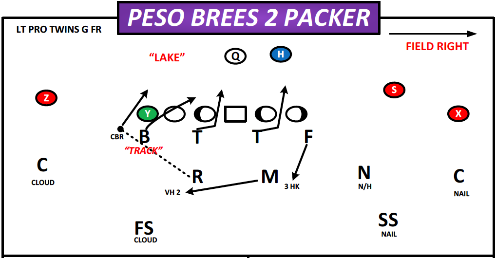 The main pressure run by Wisconsin is the BREES path or boundary edge replacement pressure (Creeper). In BREES, the “R” or Will LB will work in the C-gap as the Cut-Back/Reverse (CBR) player. If the RB is to the pressure, the OLB will have the QB, and if the RB is away, the OLB is allowed to attack the RB. The boundary EDGE (B) has a TRACK path or heel-line path, making him the “Dive” player versus Zone Read. The 3t will stunt into the A-gap reading the Center’s block while the Nose will COP or contain rush through the B-gap. Finally, the “F” will secure the run then drop or fold back into the box depending on the block of the Tackle.