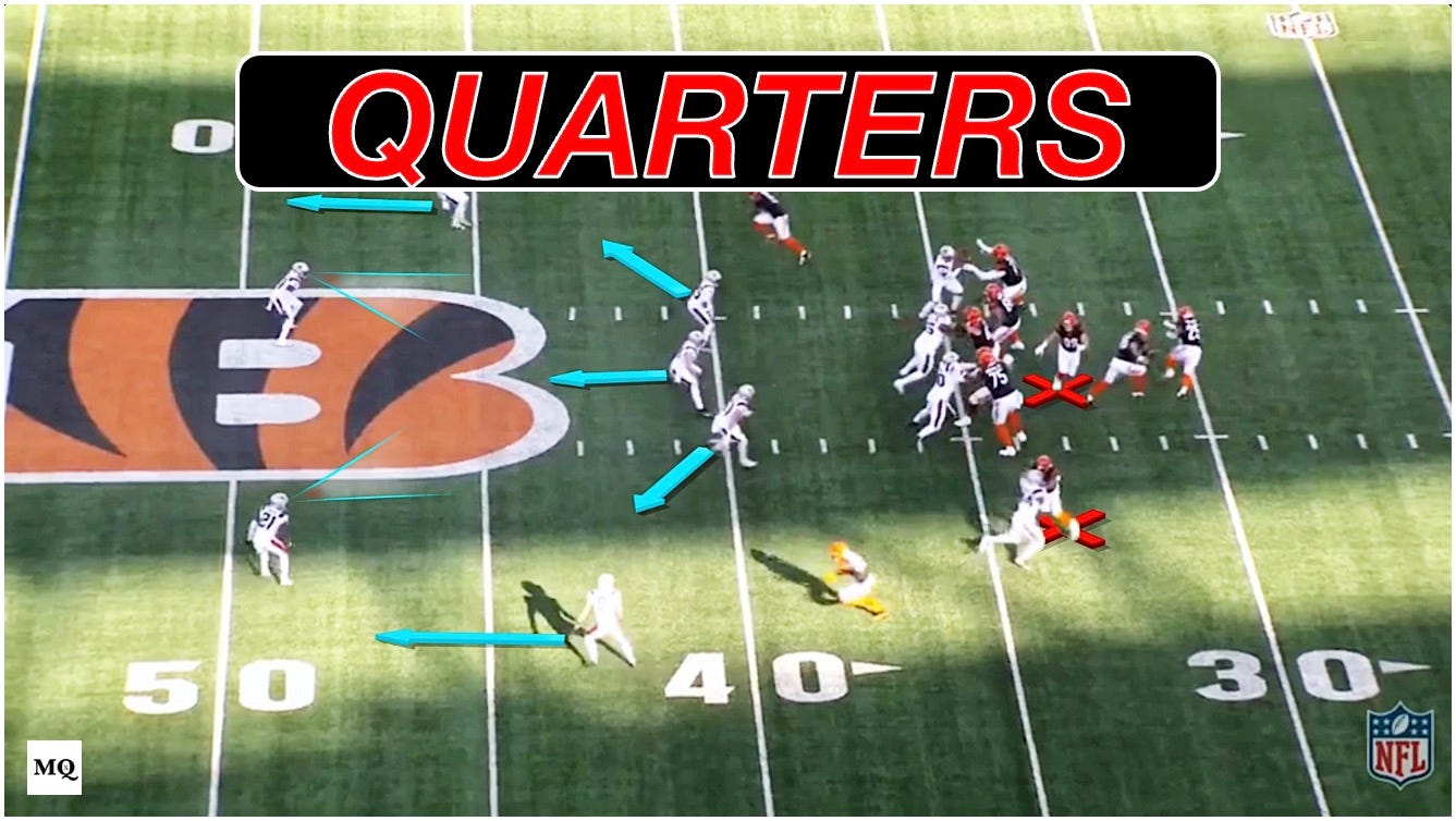 Learn the New England Patriots' Quarters structure to neutralize 12 personnel and the Bengals' condensed Egypt pass concept. This technical breakdown details the COF (Curl Over Flat) and BBYF (Ball Brings You Flat) techniques used to layer the intermediate zone and eliminate vertical dropout threats.