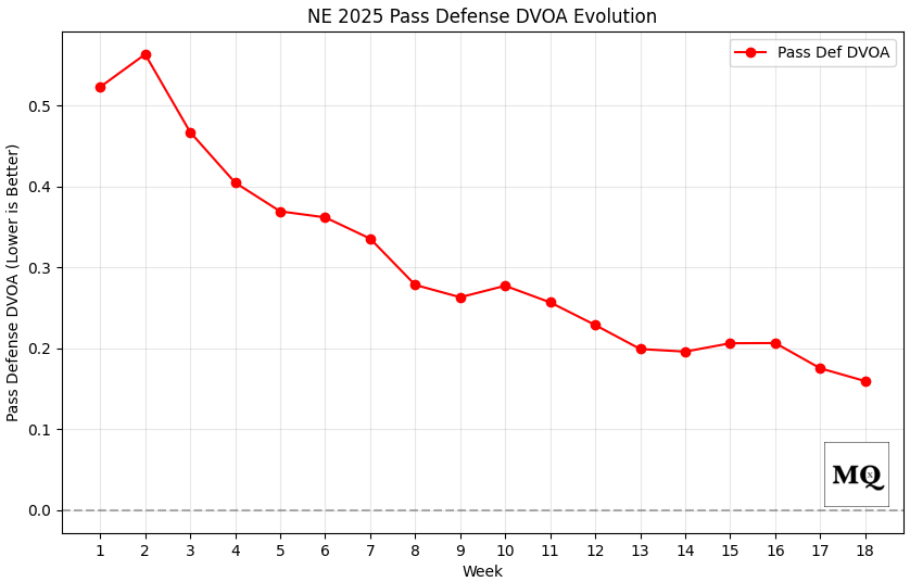 In the first month of the season, New England had the fourth-best Pass Rush Percentage (PRP) in the league, but by Week 9, it had dropped to 28th, even though they doubled their sack total from 10 to 20. Vrabel had salvaged the coverage aspect of his defense, but killed his pass rush.