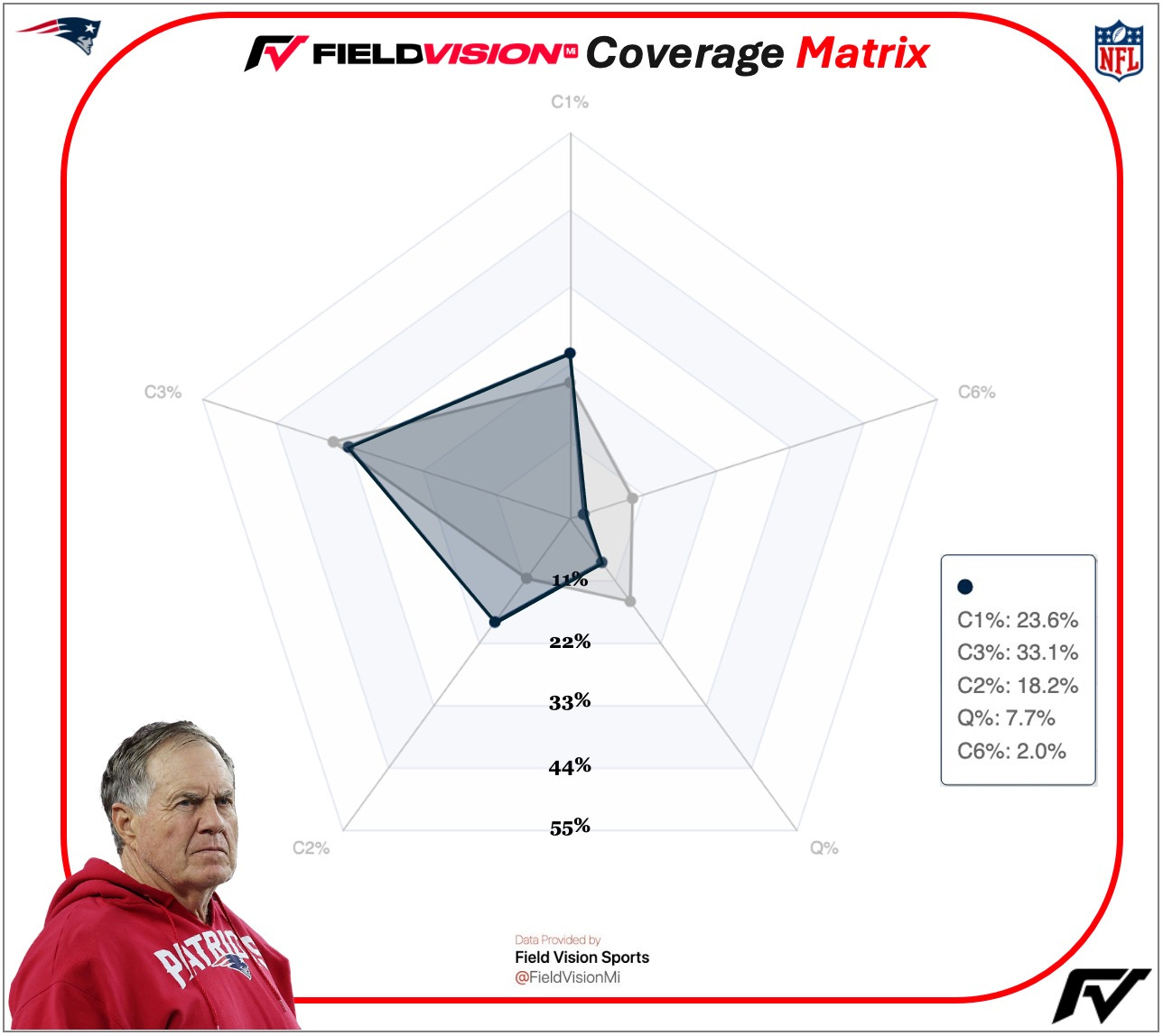 Belichick still ran most of his coverages from a closed-post look, heavily emphasizing Cover 1. Compared to last season, the rates are almost identical, with a couple of percentage points being stolen from Quarters and moved to Cover 2. The Patriots also ran more Cover 3 compared to last year, though only marginally (~3%).