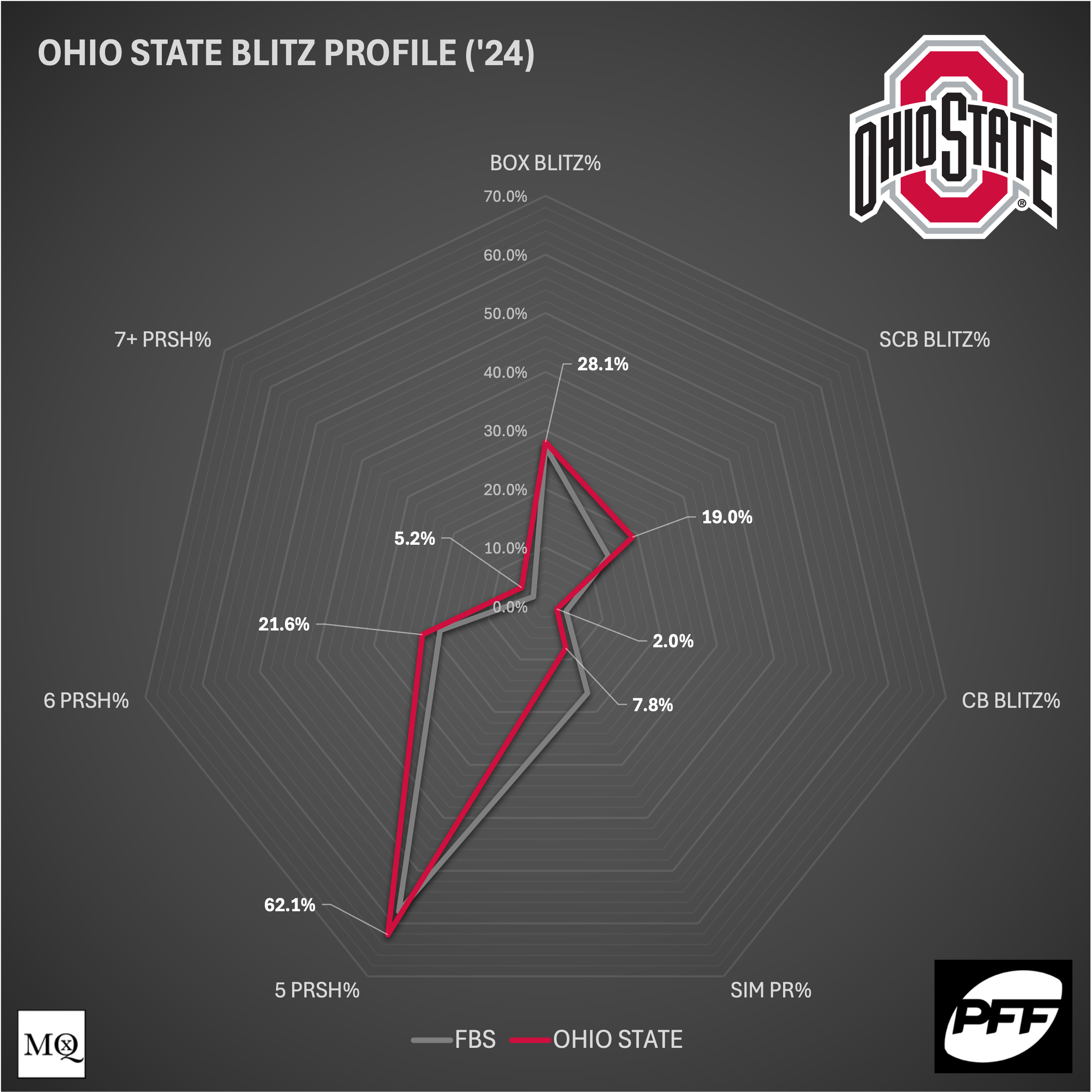 For all the fanfare surrounding the National Champion, Ohio State Buckeyes’ defensive scheme, the blitz menu is not typically towards the top of the list. Though the Buckeyes’ Blitz Rate is relatively high, 15th in the Power 4 at 37%, the concepts are not exotic. The structures may be different from week to week, but the pressure paths remained relatively simple.