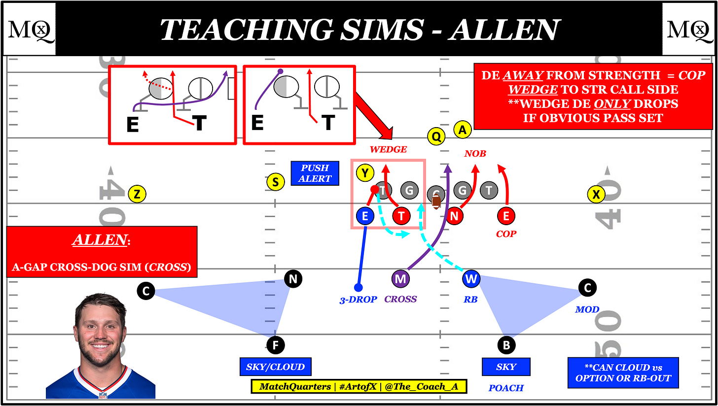 A popular pressure that has begun to pop up everywhere is one that I refer to as Allen. The internal off-ball simulated pressure allows the defense to attack the Center with a Cross (V-Tech) path by the LB opposite the RB. In ‘gun’ runs, the Center determines the run scheme. If he works away from the RB, it is typically a zone. If he works back to the RB (down block), it is usually a gap scheme or Insert (man blocking).