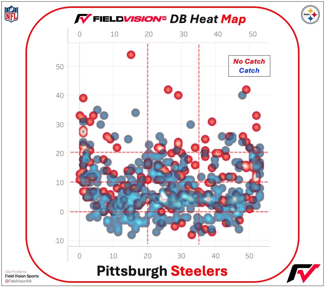 Though the Steelers have one of the higher Blitz Rates in the NFL (5th/35.8%), it is mainly due to their five-man front. Under Kieth Butler, his ‘Dog Rush’ concept was used to attack opposing offense protections with an assortment of games up front. Behind the front are mainly closed-post coverages, with the NFL’s third highest rate of Cover 3.