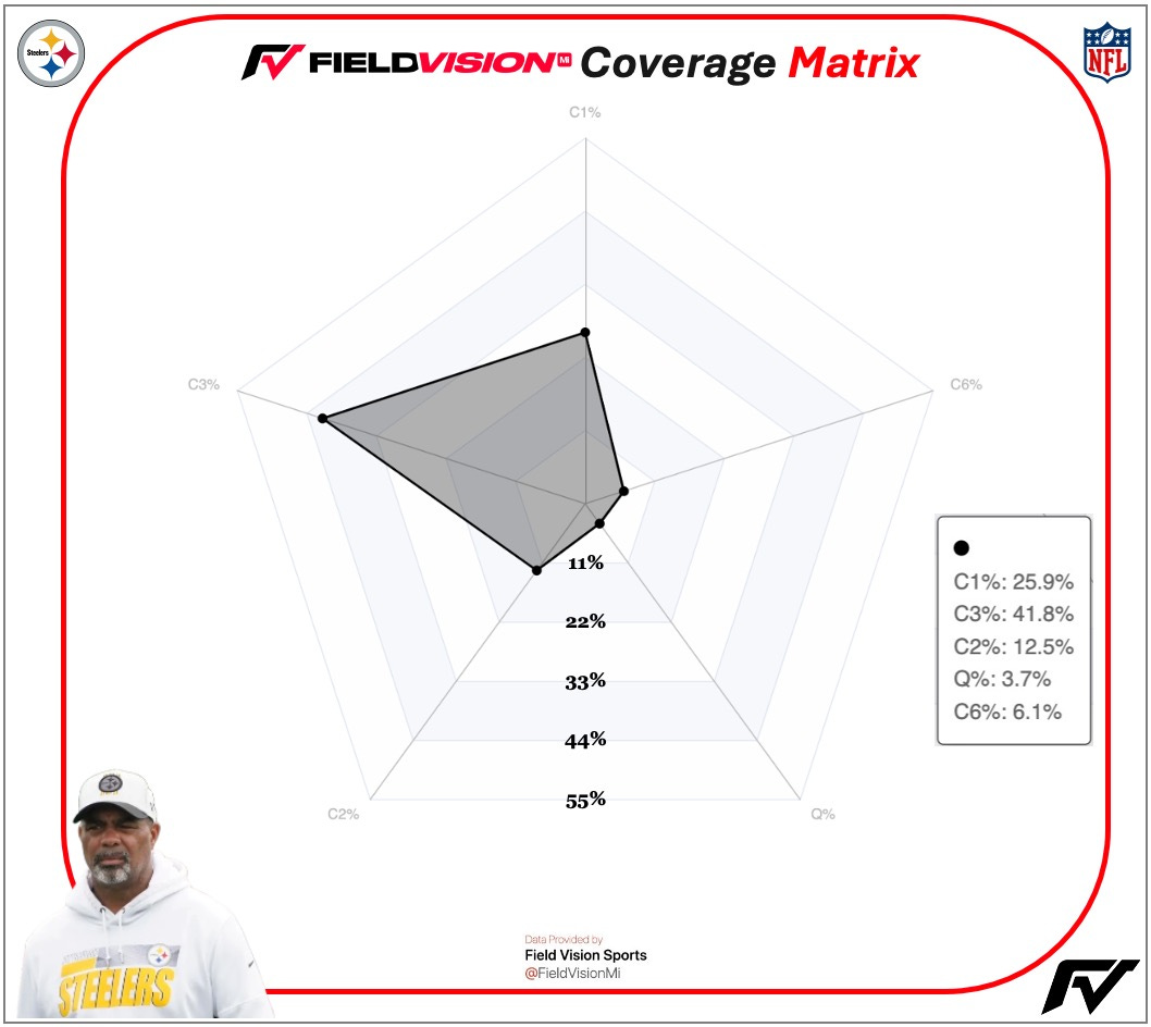 Interestingly enough, Tampa 2 defenses are mainly run from a 4-3, which is not a feature of Tomlin’s defense. The use of Tampa 2 as a ‘change-up’ call to his closed post-defense is a trait that stems from his time in Tampa Bay. Even Tomlin’s Tampa contemporaries in Lovie Smith (Texans ‘21-’22) and Matt Eberflus (Bears) only use Tampa 2 as a change-up to a close post-dominant scheme. Smith and Eberflus still prefer the four-down alignment, whereas Tomlin pivoted to the 3-4.