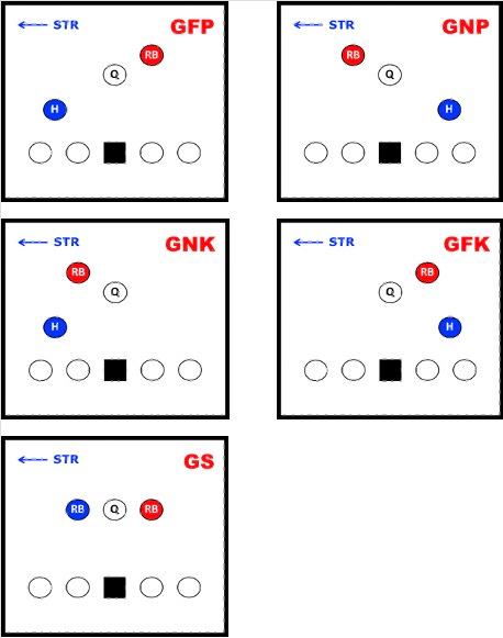 If an offense comes out in a traditional Y-off formation with two WRs to one side and another on the other, they can still create multiple formations just off-back alignment. Each one makes a new sub-section of the root ‘Set.’ Each image above would be labeled as a completely new formation. The offense could create five different formation tags without moving a WR, and they could still run Pistol!
