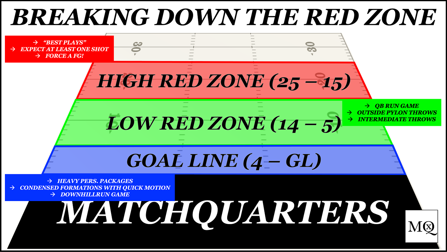 When staff section out scenarios and field zones (Red Zone above), these data points can get even more convoluted. One thing that helped me was to look at sets, motion use, and the root plays. Sometimes, teams would run shorter routes and shift to more of a power run game as they got closer to the end zone, while other teams didn’t change.