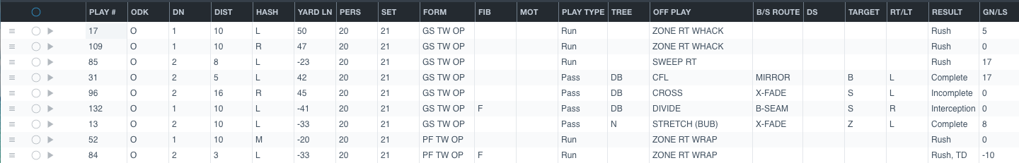 These gave me all the information I needed. When facing a team that runs different formations each week, you can cross-check root formations with the Set column. If you often have a million formations and check the Set (2x1, 3x1, 2x2, etc.), you can better understand how the offense is game-planning.