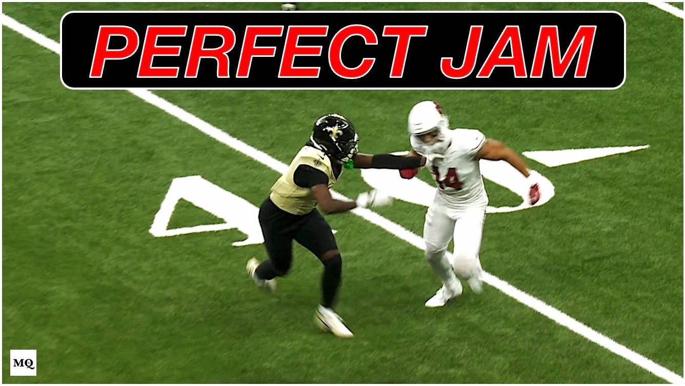 Analyze the timing and placement of the off-hand jam to disrupt the receiver's route.