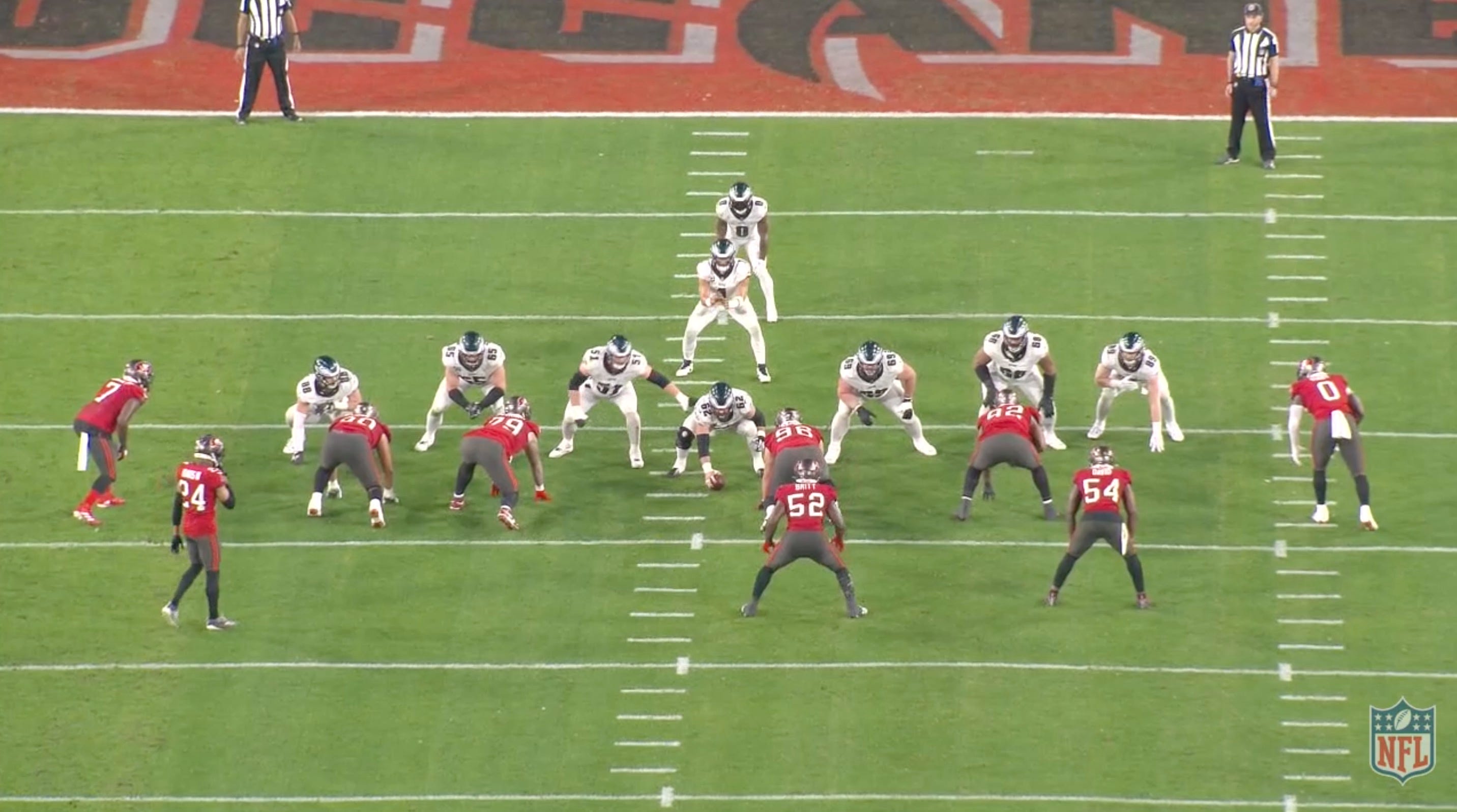 The use of six-man blitzes held the Eagles passing game in check. Hurts finished the game 4-10 with 15 yards and one sack against the coverage. The run game didn’t fair any better. The Eagles concluded their matchup with Tampa going 15 for 34 and one TD on the ground (Field Vision).