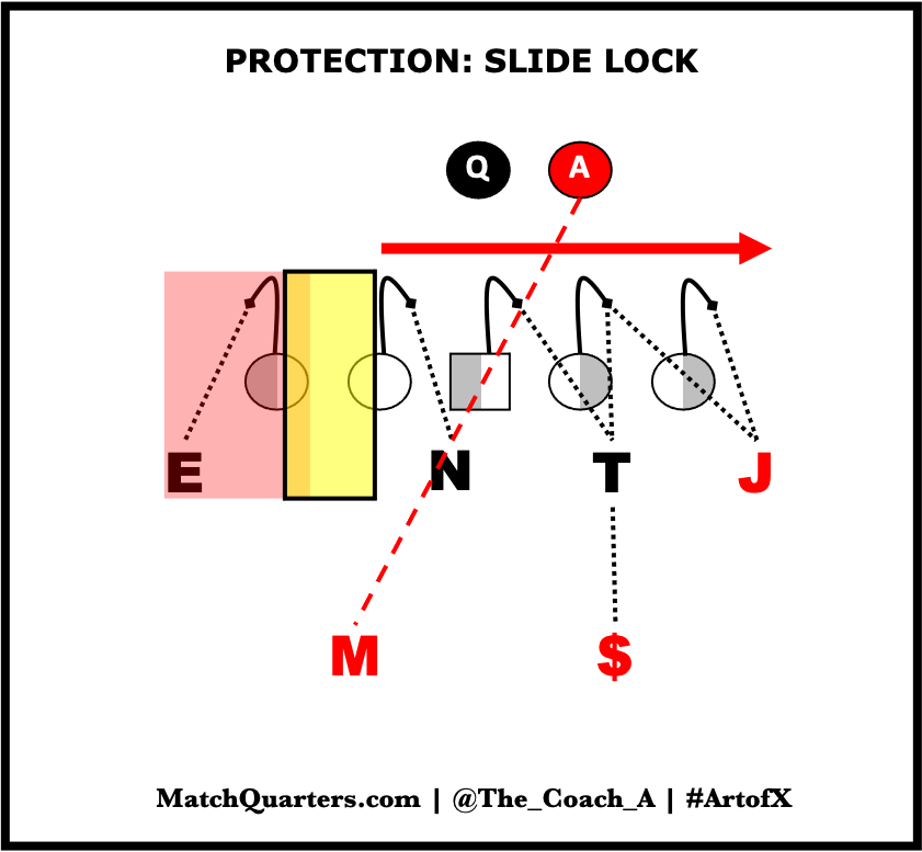 While at Baylor, we routinely attacked the Guard to the side of the RB. In many cases, we would get Slide-Lock protection (below), and the RB flared or attempted to block the first blitzer, as shown in the clip. Changing the target point with the cross-dog opens up its usefulness.