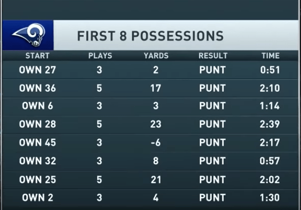 Goff would end the night 19/38 for 229 yards 0 TDs and 1 INT. The Patriots would sack Goff 4 times and the longest pass being completed for 29 yards. The first eight possessions netted eight punts and the longest drive would be a 5 play/23 yarder that only take 2:39 off the clock. The Rams’ first eight possessions are shown below.