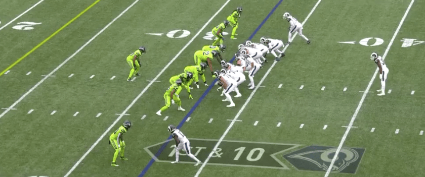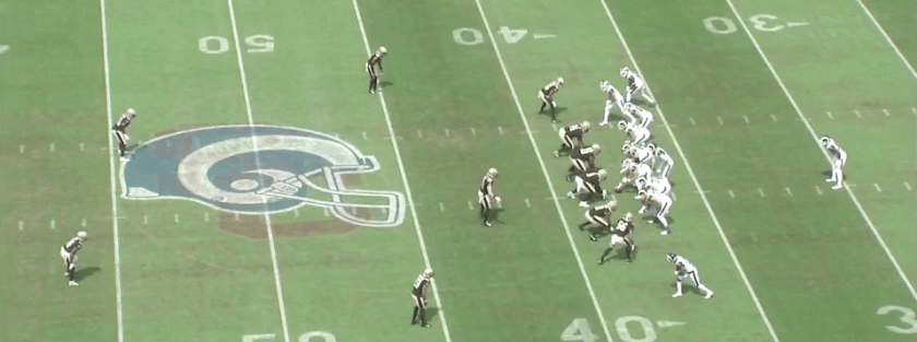 Later in the game, the Rams come back to the same shift and motion. What looks to be the same play as shown before is really a Split Stretch play. In the previous clip, the Rams were running a simple Inside Split Zone. Below, LA runs a Wide Zone to attack the edge.