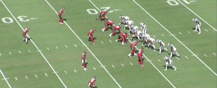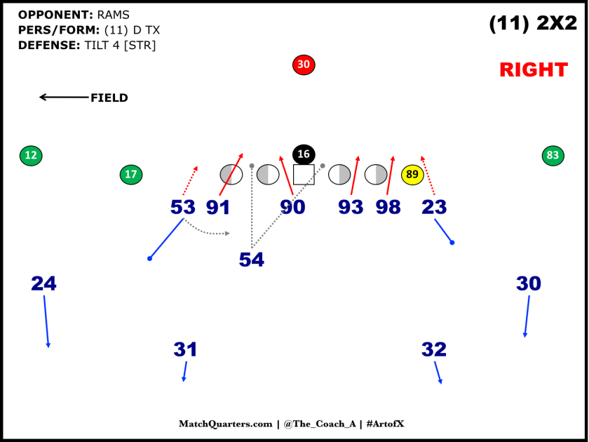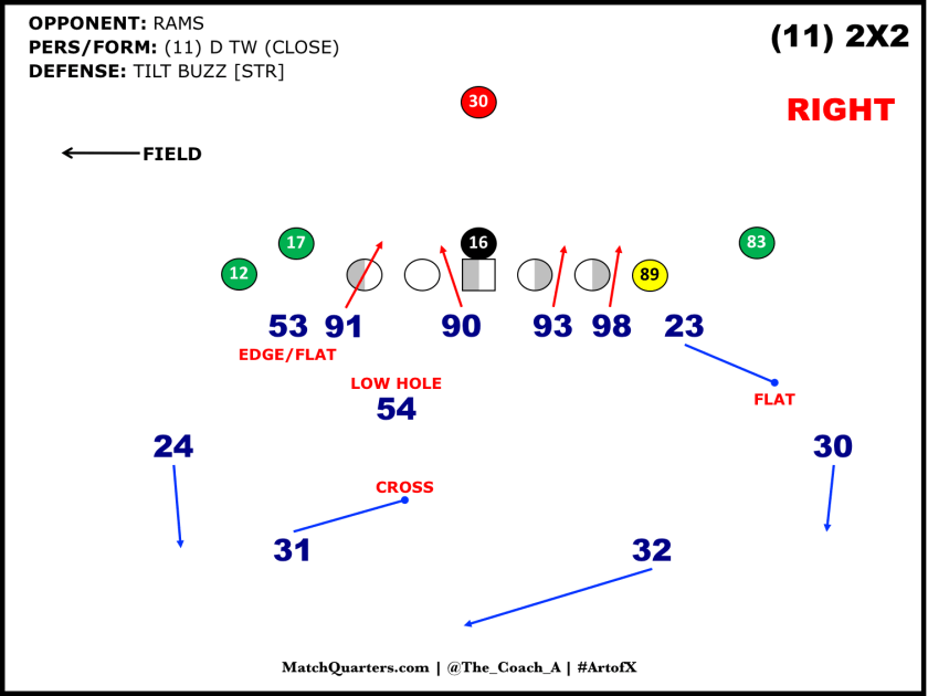 The second play of the game (shown below) was a highlight of the struggles the Rams would have all night. The Buzz coverage dropped Jones (#31) into the middle of the field. The front took care of the run game and allowed the secondary to focus on the WRs. This focus inhibited the Rams’ reliance on early-down play-action passes.