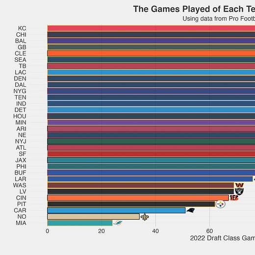 The real story in KC is a defense that features four rookies in the secondary that have played significant snaps all year. Jaylen Watson, Trent McDuffie, Joshua Williams, and Bryan Cook have all started at some point this year in the secondary. DE George Karlaftis has excelled as well. Where Philly went and “bought” their Super Bowl appearance, KC did the opposite, relying on the draft and a freak at QB to do the work. As Sumer Sports points out, the Chiefs had by far the most rookie games played by a playoff team.