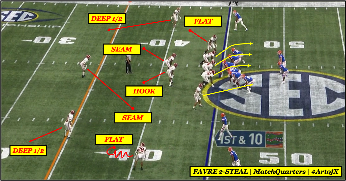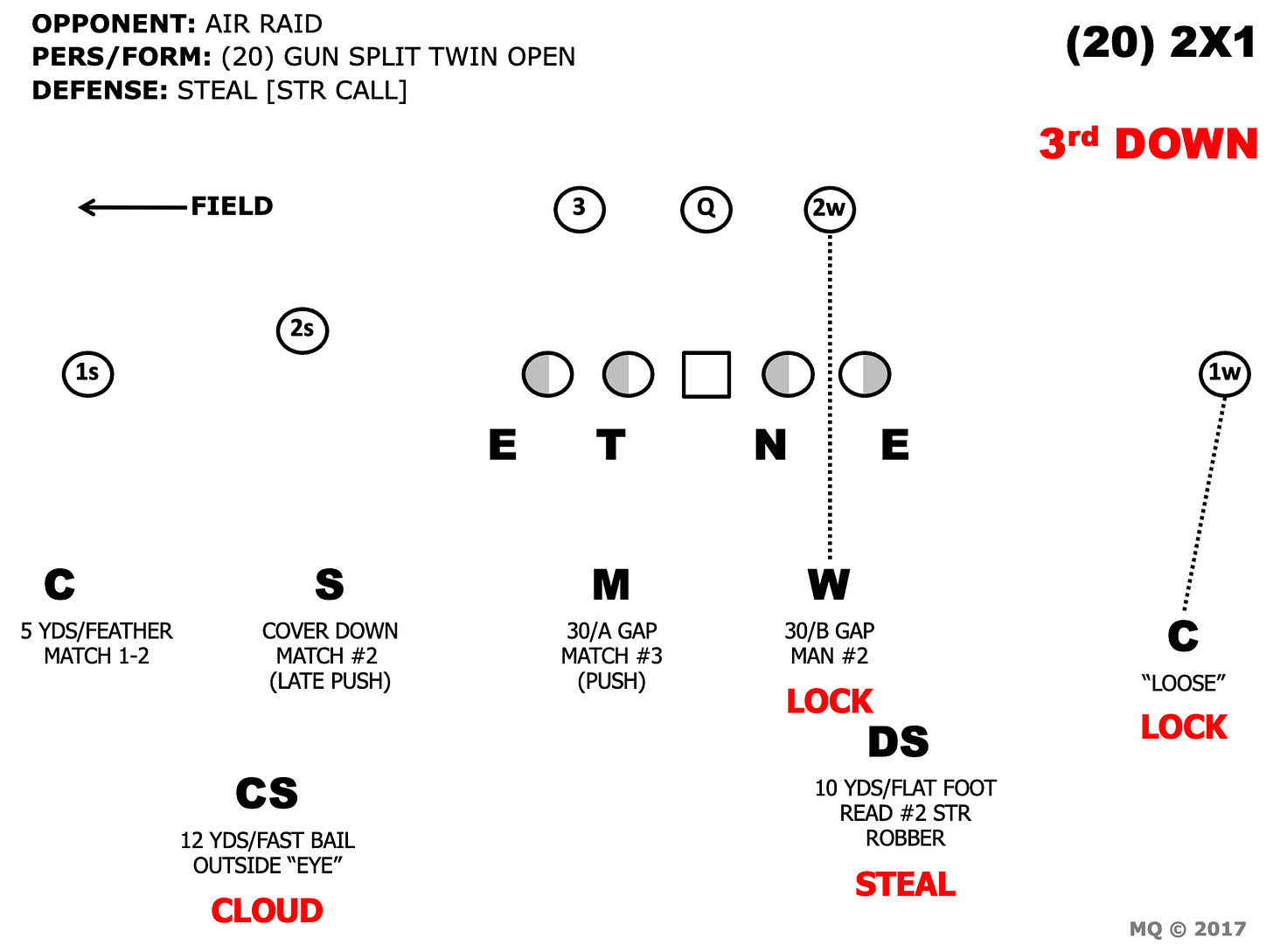 The beauty of STEAL coverage is in its fluidity. A defense can “steal” any part it wants to. Playing on the recent trend of in-breaking RPOs, it is easy to see why STEAL coverage has been a nice change-up for defenses running split-field coverage. The defense is baiting the QB to throw right where they are going to rob the coverage.