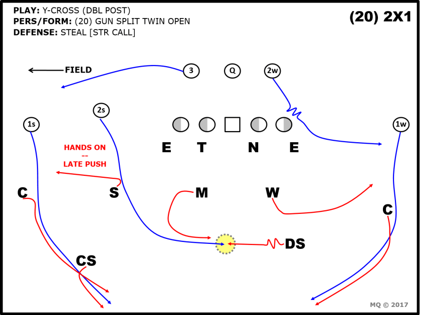 The coverage was designed to eliminate the Deep Cross in Y-Over and leverage the front side Safety against the Corner in Y-Corner. On the backside of the coverage, the Will and boundary CB (BC) are locked on their WR. At the snap of the ball, the DS will shuffle into the middle of the field, reading the departure of #2. The DS will collect any Over route or Dig. The CS is now able to work to #1. One concept from the Y-Cross tree is the Double Post or Mills concept.
