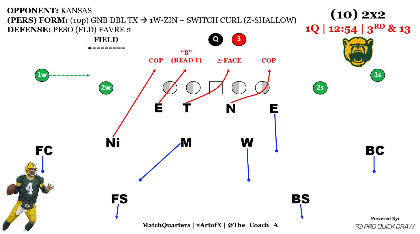 To take this coverage to the next level, the defense can use it alongside a field Creeper (FAVRE) and trigger a throw to the Slot. Most offenses are running more in-breaking routes and moving away from the WR screen game in their RPOs. The Slant is a much more viable option and higher percentage through. Combined with play-action, and the Slot can easily adjust to the depth of the ILB. All the QB has to do is throw to space.