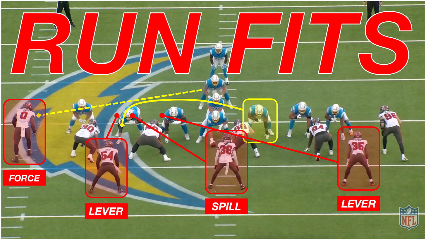 Illustrate how Tampa Bay’s run fit structure stays consistent versus different offensive personnel groupings.