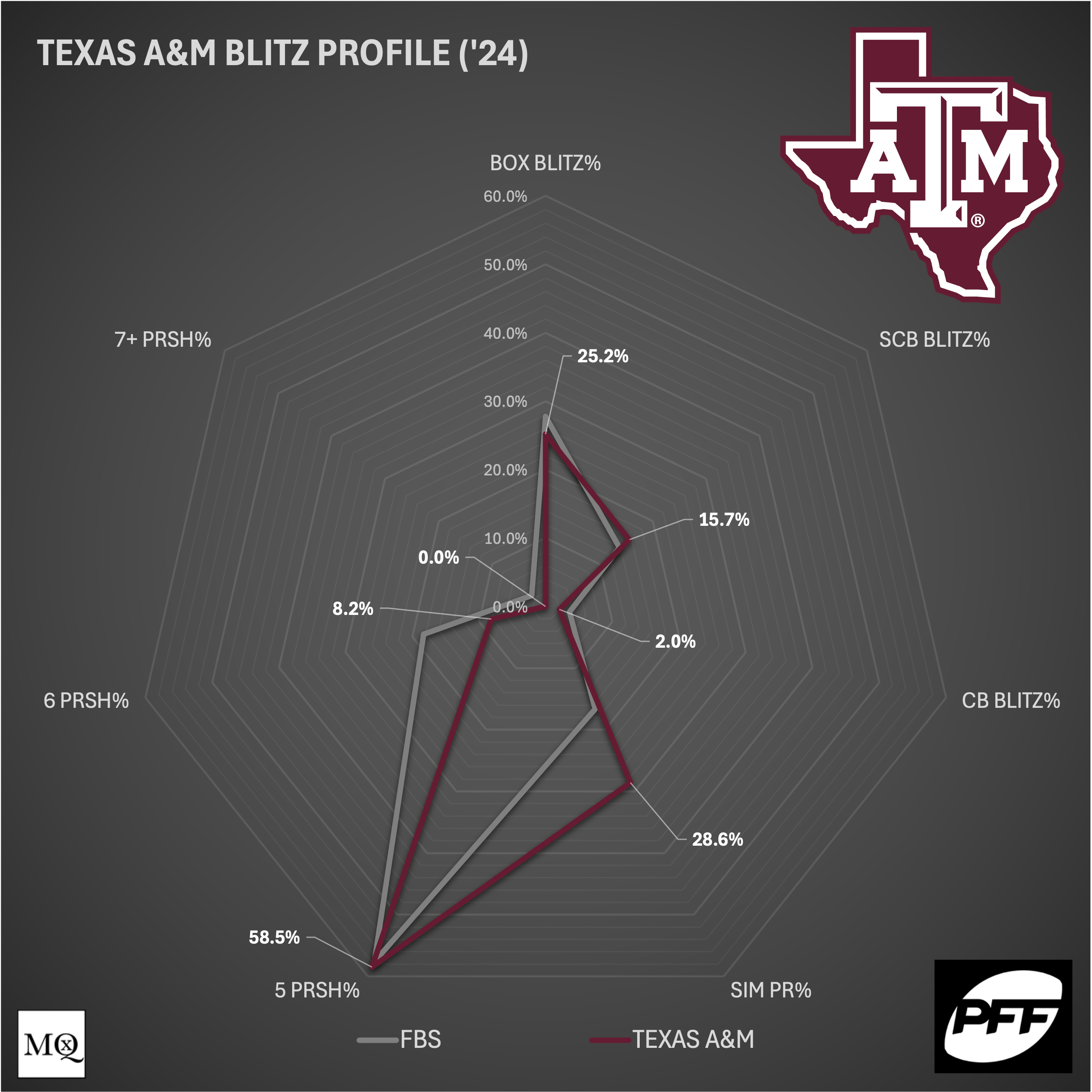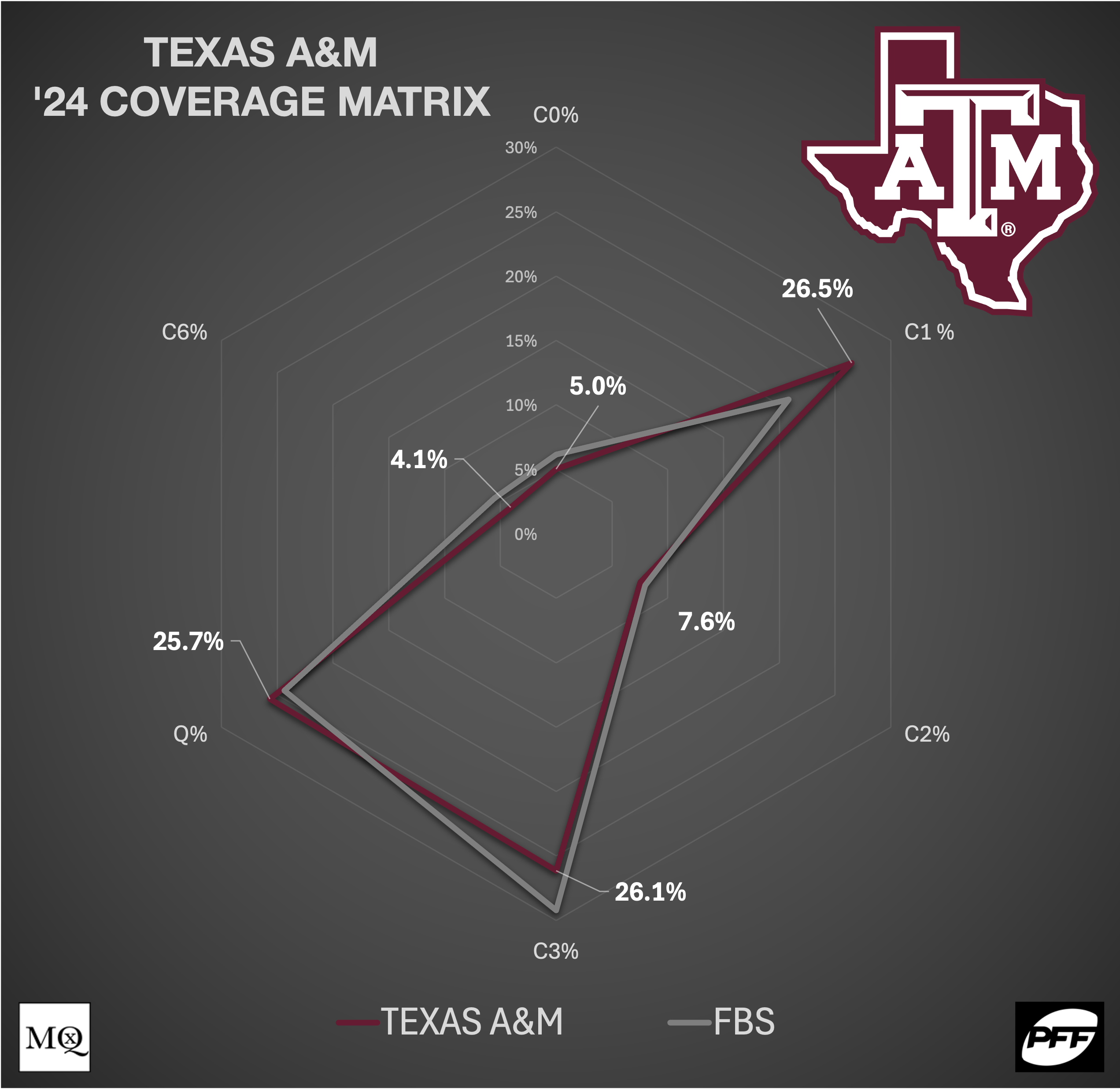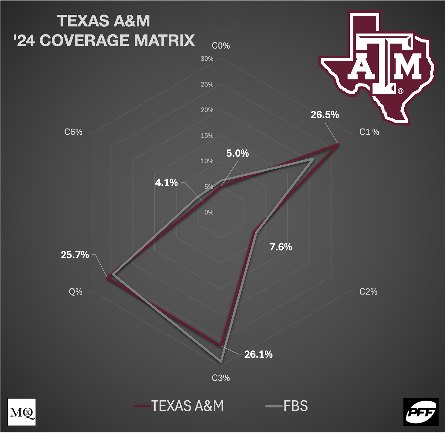 Looking at A&M’s coverage matrix, Elko essentially called the ‘average’ FBS defense in ‘24, with slightly more Cover 1 instead of Cover 3. The Aggies would finish in the top third in Cover 1 usage (34th) and ran the coverage almost exclusively behind their pressures (profile above).
