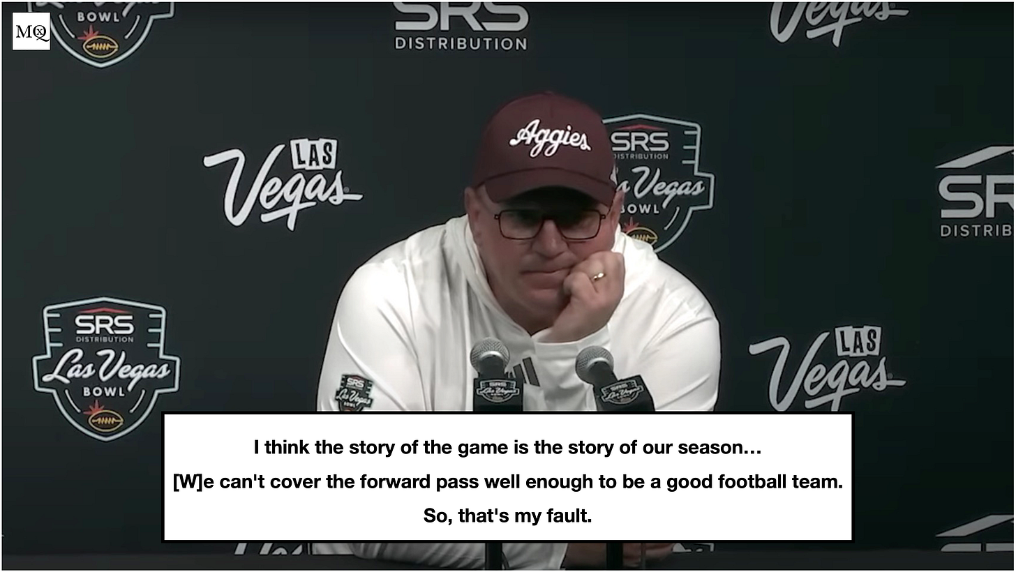 After the Las Vegas Bowl, a dejected Mike Elko sat before the microphones. He credited USC with the victory, mentioned the seniors and their hard work, and then asked for questions. Before he got too far into his post-game presser, he made a direct statement about the season, uttering the phrase, ‘[We] can’t cover the forward pass…’