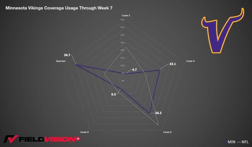 Instead of locking up the outside and taking the chance that defenders won't see the run quickly enough, Flores shifts his defense into primarily zone coverage. Starting last year, the Vikings began using what is referred to as ‘Hot Quarters’ and running predominantly split-field coverages.
