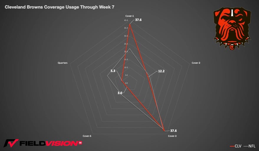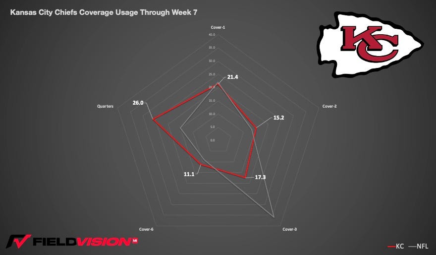 Kansas City blitzed and played man coverage en route to a Super Bowl victory over San Fransisco. In Week 7, the amount of pressures were less, but their dominance in man coverage remained.