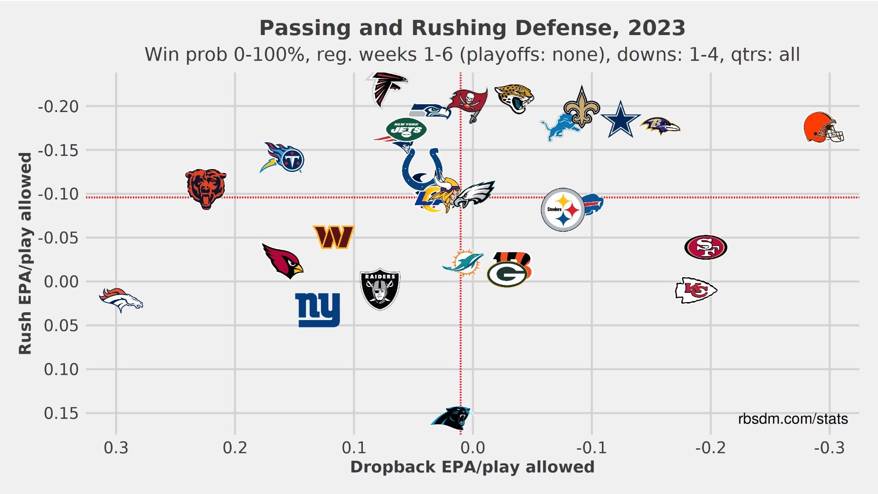 Many called for the firing of Defensive Coordinator Vance Joesph at the time, but Head Coach Sean Payton stayed the course. Denver would garner a win against the Bears but lose to the Jets the following week, where former HC Nathaniel Hackett was the OC, and again to the Chiefs on Thursday night. The Broncos had the worst defense in the NFL through six weeks, and it wasn’t particularly close (above).