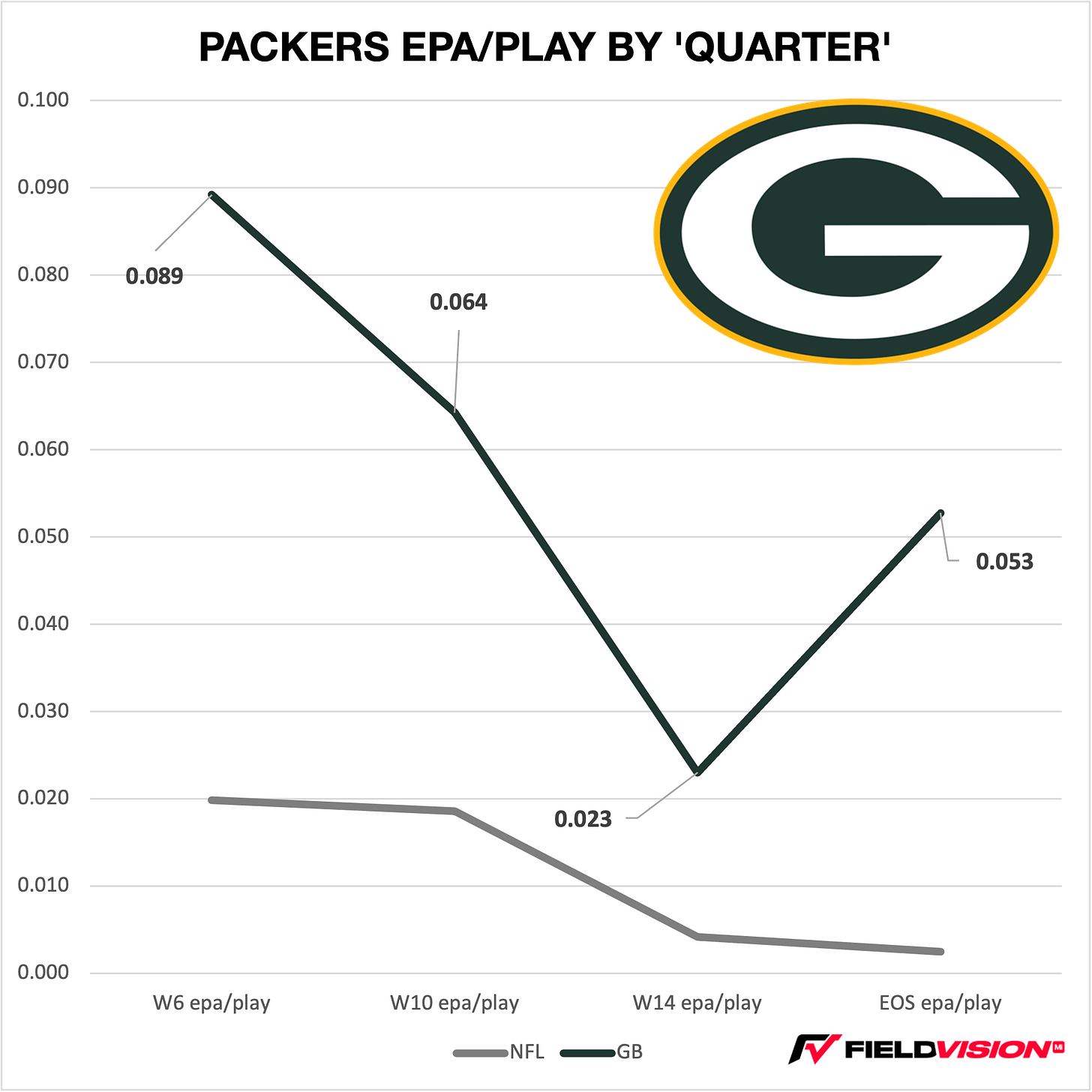 Even with players in and out of the back-end roster, the secondary played very well in Hafley’s first season. Green Bay was sixth in EPA/Dropback and had the fourth-best Turnover Worth (TOW%) throw percentage (4.5%). Though their Open Rate was 23rd, they consistently held opposing offenses in check through the air (FTN).