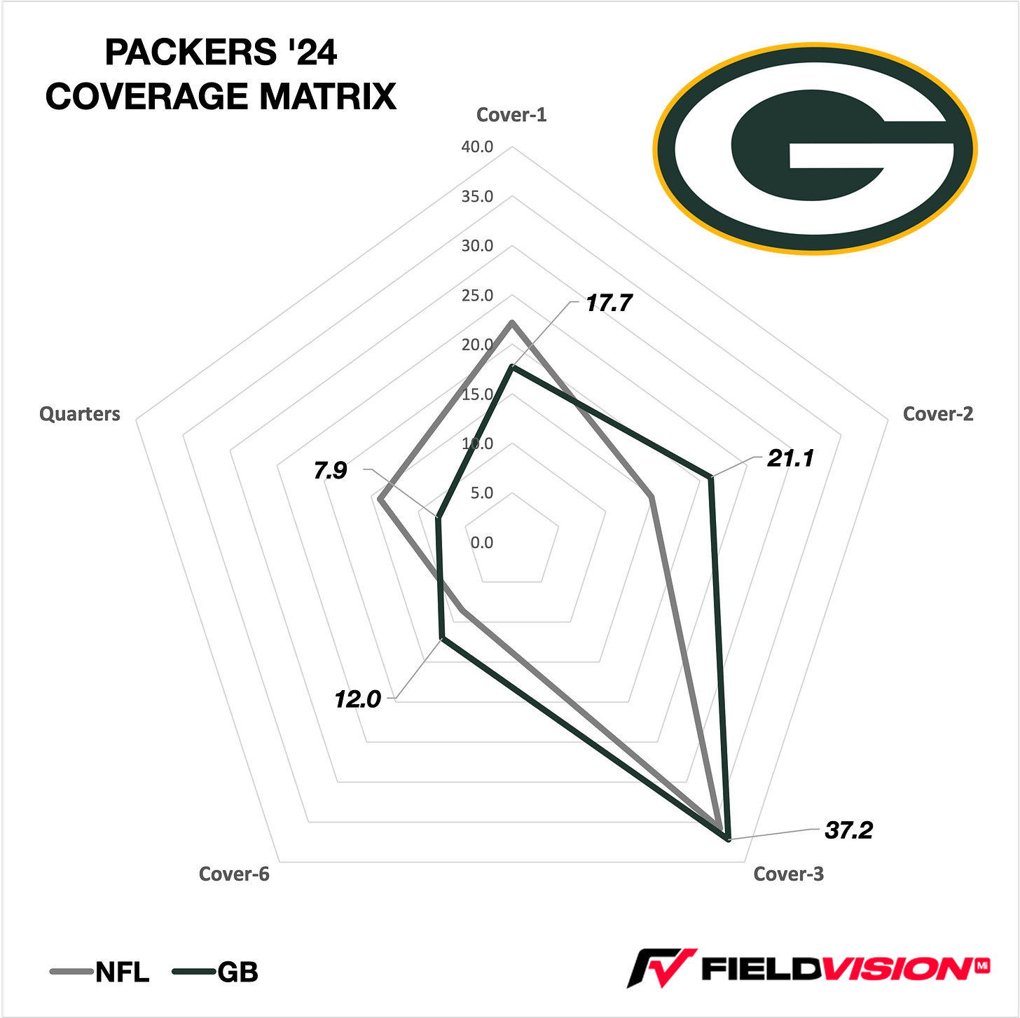 Ironically, the Packers achieved this with the second-lowest man coverage percentage in the NFL. Remember, Hafley had some of the highest Cover 1 rates at the college level. The secondary was primarily Cover 3-based, ranking third in one-high Yards Per Dropback (5.4) in the NFL and in Explosive (20+) pass percentage (FTN).